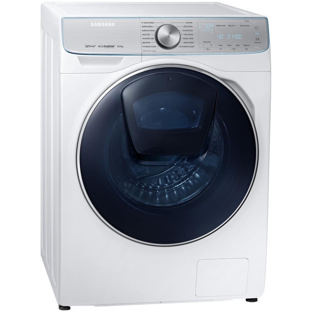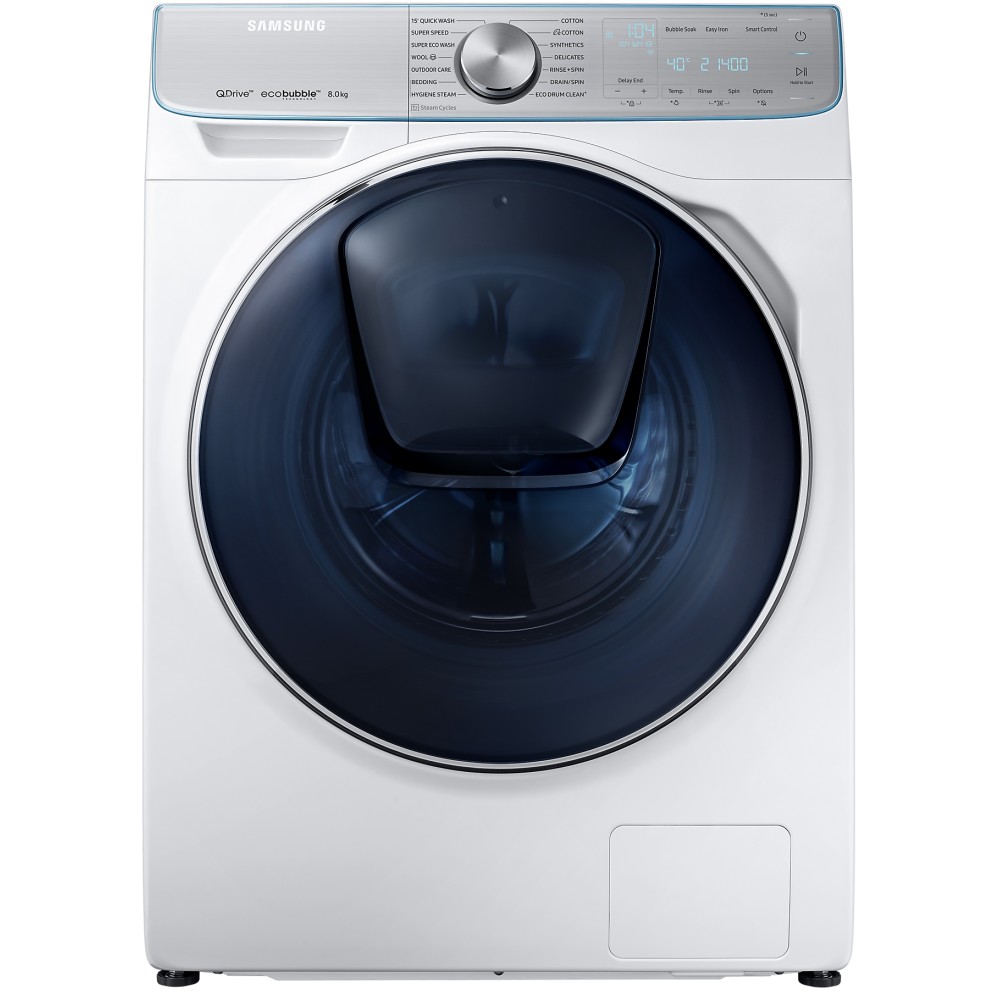 ماشین لباسشویی سامسونگ WW80M یا WW80M74FNOR رنگ سفید، یکی دیگر از ماشین لباسشویی های 2017 سامسونگ می باشد. این محصول ممکن است در بازار با مدل ماشین لباسشویی سامسونگ WW80M یا WW80 نیز به مشتری معرفی شود که البته مدل دقیقی نیست. حرف M بیانگر سال تولید محصول یعنی 2017 و عدد 80 نشان دهنده ظرفیت محصول یعنی 8 کیلویی بودن آن است. ماشین لباسشویی WW80M74FNOR با ظرفیت 8 کیلویی انتخابی مناسب برای شستشوی انواع البسه در خانواده های با جمعیت متوسط می باشد. این محصول خشک کن ندارد و با حداکثر سرعت چرخش دیگ 1400 دور در دقیقه درصد زیادی از آب اضافی البسه را گرفته و آن ها را با کمی رطوبت به شما تحویل می دهد، برای خشک شدن کامل لباس ها لازم است آن ها را در هوای آزاد آویزان کرده یا در خشک کن مجزا قرار دهید.
