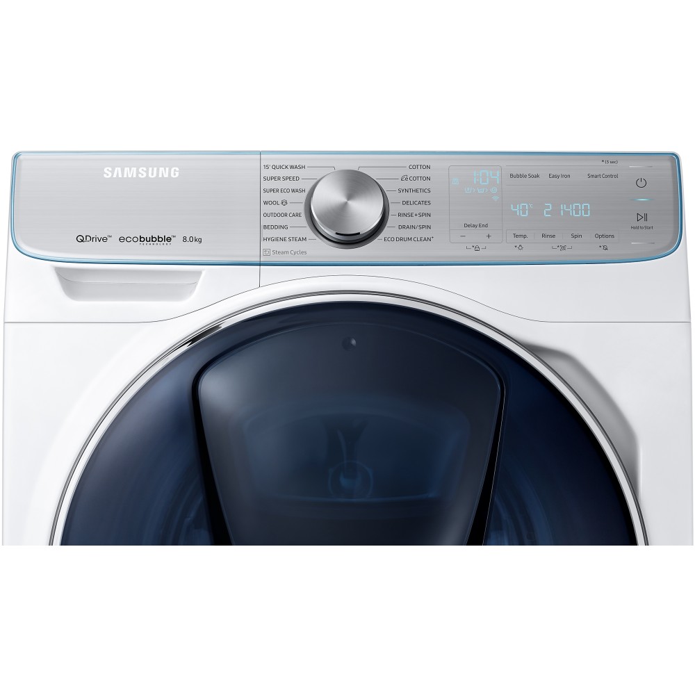 ماشین لباسشویی سامسونگ WW80 با بدنه سفید رنگ در کنار پنل نقره ای به راحتی با انواع دکور ها سازگار می باشد. رنگ درب شیشه ماشین لباسشویی به رنگ مشکی است که سامسونگ آن را Crystal Blue نیز معرفی کرده است و دارای حاشیه ای به رنگ نقره ای می باشد. شما می توانید به کمک پنل روی دستگاه به برنامه های شستشو و قابلیت های دستگاه دسترسی داشته باشید و از طریق دکمه های فشاری و پیچی روی دستگاه آن ها را تنظیم نمایید. از طریق این پنل امکان دسترسی به اطلاعاتی مانند مدت زمان شستشو، وضعیت شستشو و برخی موارد دیگر برای شما وجود دارد. کشوی مواد شوینده این محصول دارای 3 محفظه برای اضافه کردن مواد شوینده برای شستشوی اصلی، لکه بر و مواد شوینده برای مرحله پیش شستشو است که شما می توانید بسته به نیاز خود از هر کدام از محفظه ها استفاده نمایید. محفظه مواد شوینده این محصول دارای ویژگی StayClean Drawer است که به صورت خودکار داخل محفظه را تمیز کرده و از به جا ماندن ذرات شوینده در داخل آن جلوگیری می کند. دیگ شستشوی این محصول مجهز به چراغ روشنایی داخلی می باشد و شما می توانید به راحتی در حین کار دستگاه داخل دیگ را مشاهده نمایید، با نگه داشتن دکمه Temp به مدت 3 ثانیه قابلیت Drum Light فعال می شود و شما می توانید به وسیله آن چراغ داخلی دیگ را روشن و یا خاموش نمایید، البته در صورتی که فراموش کردید چراغ داخلی دیگ را خاموش کنید پس از گذشت 2 دقیقه به صورت خودکار خاموش خواهد شد.