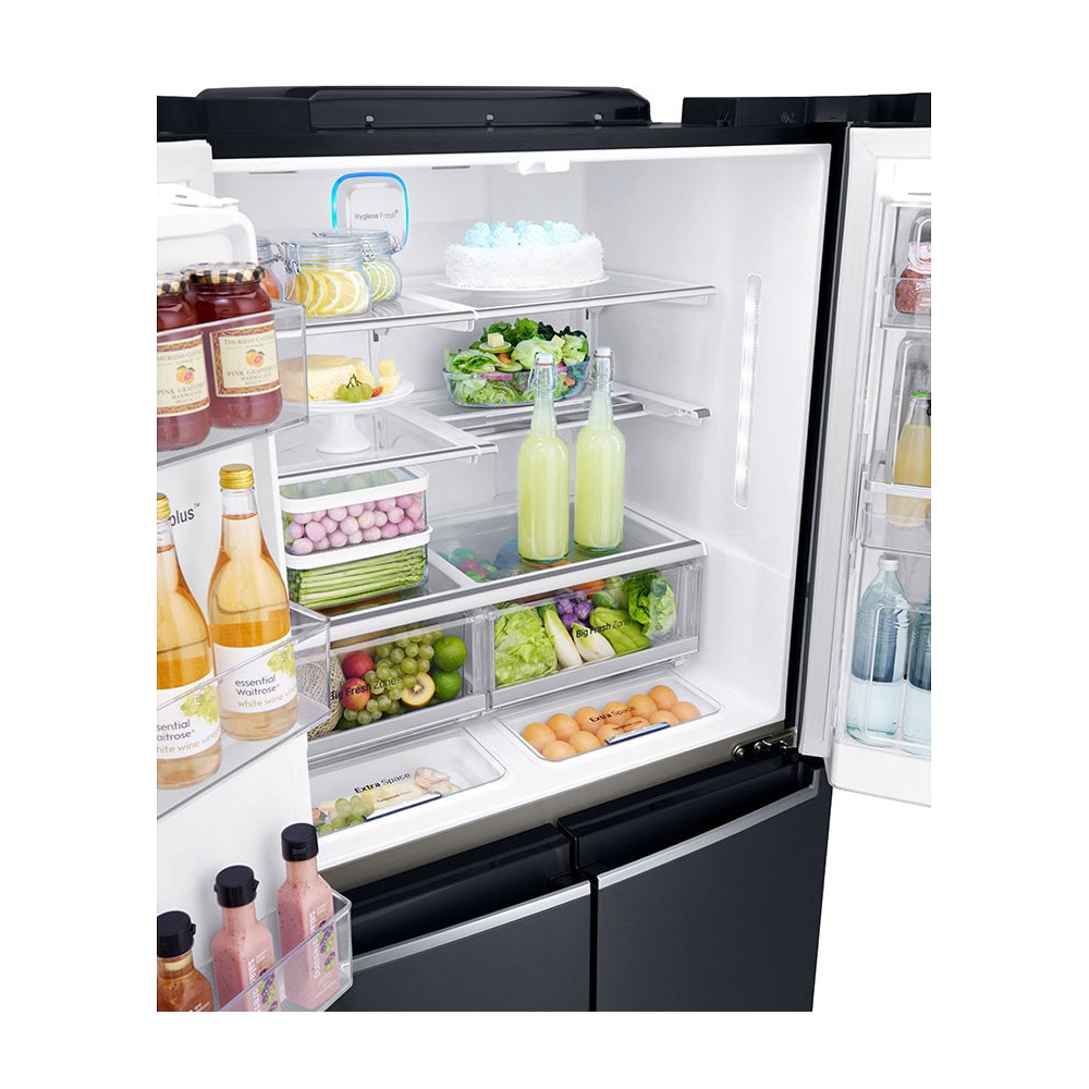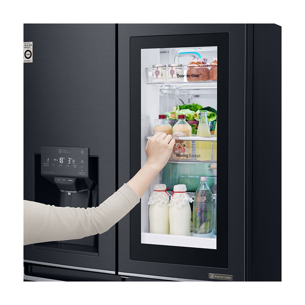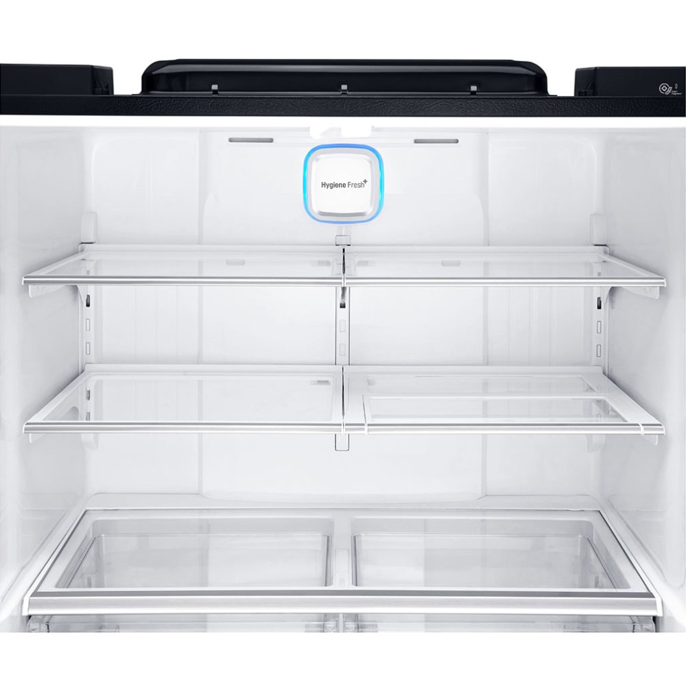 یخچال فریزر مشکی رنگ ال جی GR-X31FTMHL طراحی بسیار شیک، لوکس و مینیمالی دارد و برای کسانی که آشپزخانه آنها دکوراسیون مشکی یا تیره رنگ دارند، کاملا مناسب است. البته که انتخاب رنگ موضوع سلیقه ای است و شما می توانید این یخچال فریزر را با هر نوع دکوراسیونی هماهنگ کنید. بدنه این محصول از جنس استیل ضد زنگ و به رنگ مشکی مات (Matte Black) است و زیبایی خاصی دارد. دستگیره این محصول از نوع Square Pocket Handle است که به دستگیره مخفی یا پاکتی نیز معروف می باشد. طراحی این دستگیره ها باعث شده تا زیبایی یخچال دوچندان شود. همانطور که قبلا عرض کردیم، یخچال این محصول در قسمت بالا و فریزر آن در قسمت پایین می باشد، به همین دلیل به آن یخچال فریزر بالا پایین نیز گفته می شود. علاوه بر آن به دلیل طراحی خاصی که این محصول دارد، به یخچال فریزر ساید بای ساید و همینطور فرنچ (درب فرانسوی) نیز معروف است. این یخچال فریزر 4 درب بزرگ دارد اما با توجه به اینکه دارای قابلیت درب در درب نیز می باشد، در بازار به یخچال فریزر 5 درب نیز معروف است. البته برخی فروشگاه ها و فروشندگان قابلیت درب در درب ال جی را به عنوان مینی بار نیز معرفی می کنند که البته اشتباه است. مینی بار به محفظه و درب کوچکی گفته می شود که تنها به برخی نوشیدنی ها از طریق آن دستیری خواهید داشت اما درب در درب (Door-in-Door) به شما اجازه می دهد تا بدون باز کردن درب اصلی یخچال، به راحتی به مواد غذایی مختلف داخل بخشی از یخچال دسترسی داشته باشید؛ به این ترتیب از هدر رفت سرما تا حدود 41% جلوگیری می شود و در مصرف انرژی نیز صرفه جویی خواهد شد. برای استفاده از قابلیت Door in Door و دسترسی به آن یک اهرم کوچک در قسمت دستگیره یخچال وجود دارد که با فشردن آن می توانید به راحتی به داخل یخچال دسترسی داشته باشید. ال جی از یک قفسه قابل تنظیم به نام Moving Basket نیز در این بخش استفاده نموده است که در بازار به آن قفسه آسانسوری نیز گفته می شود. شما می توانید این قفسه را به سمت پایین یا بالا حرکت داده و حتی به مواد غذایی با ابعاد بزرگ تر نیز در داخل یخچال دسترسی داشته باشید. یکی از جذاب ترین بخش های این محصول، اینستاویو یا به انگلیسی InstaView آن می باشد. ال جی روی قسمت درب در درب این محصول یک محفظه شیشه ای تعبیه کرده است که با دو بار ضربه زدن روی آن یا به اصطلاح Knock, Knock (شبیه در زدن) چراغ داخل یخچال روشن می شود و شما بدون اینکه درب یخچال را باز کنید، می توانید داخل آن را مشاهده کنید. این موضوع باعث می شود تا مواد غذایی مد نظر خود را قبل از باز کردن درب یخچال مشاهده نموده و سپس درب یخچال را باز کرده و در سریع ترین زمان ممکن مواد غذایی را از داخل یخچال بردارید. این ویژگی باعث هدر رفت سرمای کمتر و صرفه جویی در مصرف انرژی می شود و از نظر ظاهری نیز جلوه زیبایی به محصول داده و باعث زیباتر شدن آشپزخانه شما نیز خواهد شد. همانطور که پیش تر نیز عرض کردیم، این یخچال فریزر دارای آب ریز و یخ ریز است و برای تامین آب مورد نیاز به لوله کشی آب شهر متصل می شود و مخزن آن ندارد؛ به این ترتیب نیاز نیست نگران خالی شدن مخزن آب آن باشید و همیشه به آب و یخ تمیز و بهداشتی دسترسی خواهید داشت. شما می توانید از پنل کنترلی روی درب یخچال مشخص کنید که احتیاج به آب دارید یا یخ و سپس لیوان یا ظرف مورد نظر خود را در زیر آب ریز و یخ ریز قرار داده و اهرم آن را فشار دهید تا با توجه به نیاز شما عمل کرده و ظرف شما را پر کند. محصول پیش روی شما دارای سیستم یخ ساز اتوماتیک یا به انگلیسی SpacePlus Ice System است که ابعاد باریکی دارد و فضای بسیار کمی را از یخچال اشغال می کند. این محصول تکنولوژی Bio Shield (Gasket) نیز دارد که در واقع واشر و لاستیکی است که دور درب یخچال فریزر وجود دارد و مانع از عبور هوای سرد به بیرون می شود. این لاستیک و واشر ضد باکتری بوده و شما می توانید آن را جدا کرده و شستشو داده و سپس دوباره در جای خود قرار دهید.