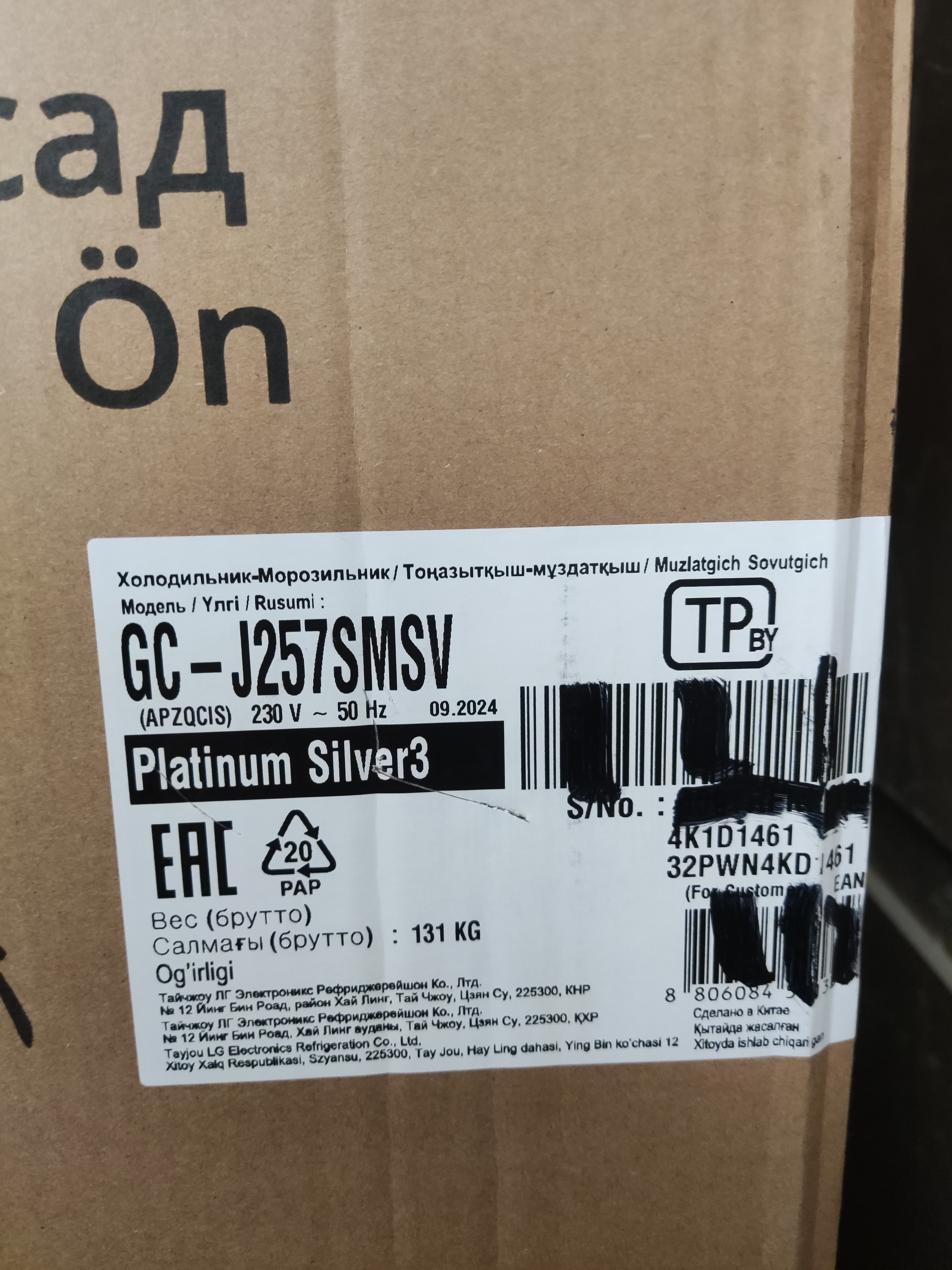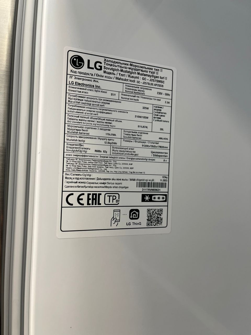 با توجه به عکس ارسالی شما، یخچال فریزر ال جی GC-J257SMSV در سایت رسمی ال جی وجود دارد اما ال جی یا اطلاعات آن را پاک کرده یا هنوز اطلاعات آن را کامل نکرده است اما صفحه ساپورت آن وجود دارد. این یخچال فریزر مونتاژ چین (سفارش روسیه) است و نوشته های روی برچسب مدل ارسالی شما به زبان روسی است. خیر با توجه به برچسب مدل روی جعبه این یخچال فریزر تقلبی نیست. لازم است از برچسب مدلی که داخل یخچال فریزر نصب شده است نیز عکس ارسال کنید. همینطور از فضای داخلی یخچال و فریزر به طور که کل یخچال فریزر واضح و مشخص باشد نیز عکس با کیفیت تهیه کرده و ارسال نمایید. علاوه بر آن از قسمت آب ریز و یخ ریز (در صورت داشتن آن) و همینطور پنل کنترلی یخچال فریزر و همینطور پشت یخچال فریزر عکس با کیفیت تهیه کرده و ارسال نمایید تا دقیق تر خدمت شما عرض کنیم که این یخچال فریزر اصل است یا خیر.