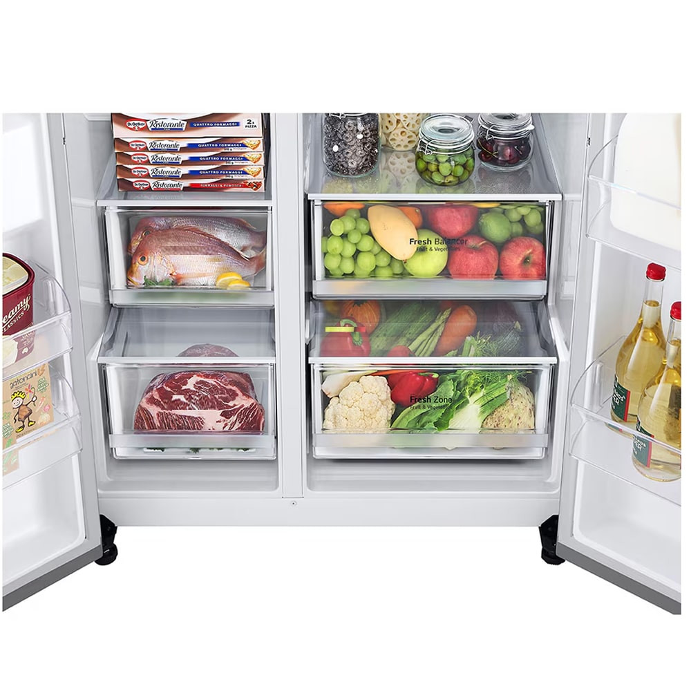 یخچال فریزر LG GC-J257SMSV ترکیبی بینظیر از سبک، کارایی و نوآوری است که آن را به انتخابی ایدهآل برای خانوادههای مدرن تبدیل میکند. این یخچال با روکش نقرهای و ظرفیت جادار 674 لیتری، برای رفع نیازهای ذخیرهسازی روزانه تمام خانواده شما طراحی شده است. طراحی نوآورانه Door-in-Door این طراحی منحصر به فرد به کاربران این امکان را میدهد که بدون باز کردن کل یخچال به راحتی چیزهایی را که مرتبا استفاده میشوند مانند نوشیدنیها، میان وعدههای سریع و غیره را بدون باز کردن کل یخچال بردارید. این به جلوگیری از خروج هوای سرد کمک میکند و به غذا اجازه میدهد تا برای مدت طولانیتری تازه بماند و به کاهش مصرف انرژی، حفظ تازگی اقلام ذخیره شده و ایجاد یک سیستم ذخیرهسازی سازمانیافتهتر کمک میکند. وقتی دربهای یخچال را باز میکنید، با فضایی روبهرو میشوید که به دقت برای کارایی و راحتی طراحی شده است. با ظرفیت کل حدود 674 لیتر، این یخچال به دو بخش تقسیم میشود: فریزر در سمت چپ و یخچال در سمت راست، که دسترسی آسان را برای کاربرانی که از خم شدنهای مکرر در مدلهای قدیمی خسته شدهاند، فراهم میکند. در بخش داخلی یخچال، قفسهها به صورت نیمعرض هستند و میتوانند در ارتفاعهای مختلف قرار گیرند و حداکثر انعطافپذیری را فراهم کنند. سطلهای درب سمت راست نیز قابل تنظیم هستند و طراحی پهن و شفاف قفسهها تشخیص چاشنیها یا اقلام کوچک را در یک نگاه آسان میکند. این یخچال همچنین دارای دو کشوی بزرگ برای نگهداری مواد غذایی است که مخصوص نگهداری مواد غذایی است به راحتی به بیرون میلغزند. کشوی Fresh Zone کمی عمیقتر و عریضتر از کشوی بالایی یعنی کشوی Fresh Balancer است که دیدن و دسترسی به آنچه در داخل است را آسانتر میکند. بخش فریزر برای حداکثر ذخیرهسازی طراحی شده است، دارای قفسههای قابل تنظیم و کشوهایی است که فضای قابل استفاده بیشتری را از بالا به پایین فراهم میکند. 4 قفسه و دو کشوی بزرگ در پایین آنها به همراه دو قفسه بر روی درب از اجزای داخلی بخش فریزر میباشد که فضای کافی برای ذخیره سازی مواد غذایی منجمد را در اختیار شما قرار میدهند. با این حال، دربهای قفسه سمت چپ به دلیل محل قرارگیری یخساز، کمعمق هستند. یخچال فریزر پیش روی شما دارای سیستم یخ ساز اتوماتیک یا خودکار از نوع SpacePlus Ice System است و توانایی تولید یخ حبهای و خرد را دارد. این سیستم یخ ساز طراحی باریک دارد و روی درب فریزر قرار گرفته است. این یخ ساز مستقیما به قسمت یخ ریز متصل است و شما بدون باز کردن درب فریزر نیز میتوانید به یخ مورد نظر دسترسی داشته باشید. آبریز و یخساز داخلی در درب سمت چپ قرار دارد و آن را از دسترس دور نگه میدارد و در عین حال به راحتی میتوانید به آب سرد و یخ خرد و مکعبی دسترسی داشته باشید. یخچال فریزر مذکور قابلیت اتصال به آب شهر دارد و فاقد مخزن میباشد. این یخچال فریزر دارای 2 پنل کنترلی است. یک پنل کنترلی با دکمههای لمسی روی قسمت آب ریز و یخ ریز قرار دارد تا از طریق آن بتوانید نوع یخ خروجی را انتخاب کنید یا از آب ریز استفاده نمایید. پنل کنترلی اصلی داخل قسمت یخچال قرار دارد. این پنل کنترلی دارای دکمههای فشاری است و از طریق آن میتوانید تنظیمات یخچال فریزر فوق را مشاهده کرده و تنظیمات مورد نیاز را اعمال کنید. به طور مثال از طریق همین پنل کنترلی میتوانید از قابلیتهای Self Care، Express Cool، Express Freeze و Child Lock استفاده کرده و یا وضعیت فیلتر آب و دمای یخچال و فریزر را مشاهده یا تنظیم نمایید.