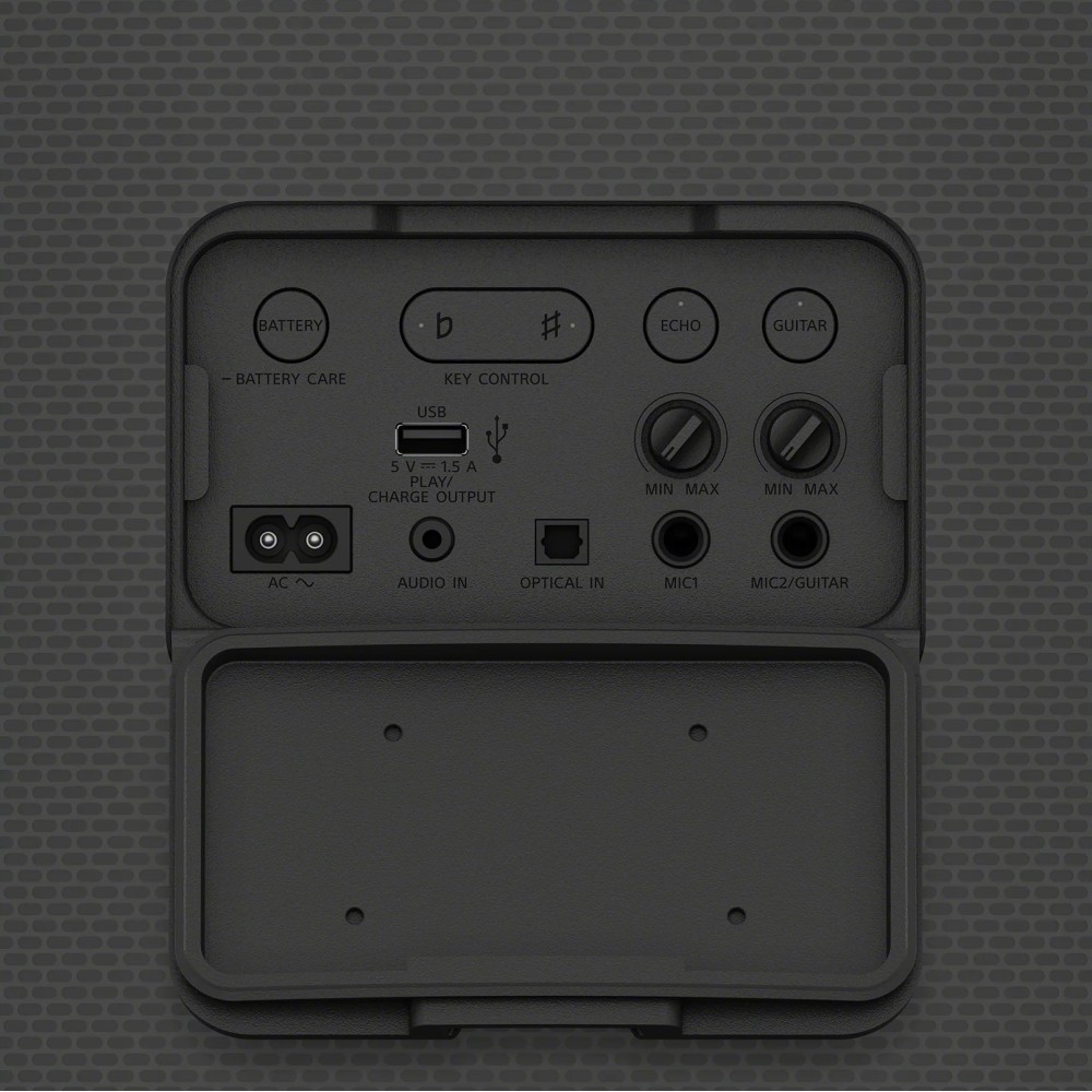- پشتیبانی از فرکانس بلوتوث 2.4 (2.4000GHz تا 2.4835GHz) پشتیبانی از برنامه Fiestable مخصوص موبایل های هوشمند اندروید و iOS برای استفاده از کارائوکه، ژست های حرکتی و کنترلی، دی جی کردن و پلی لیست آهنگ ها و ... قابلیت Stereo Pair برای اتصال بی سیم (بلوتوثی) دو اسپیکر سونی سازگار و ارائه صدای استریو قابلیت شارژ دستگاه ها از طریق پورت USB با ولتاژ 5 ولت و توان 1.5 آمپر قابلیت Power On/Off Sound برای پخش صدا هنگام روشن و خاموش شدن اسپیکر دارای 1 پورت USB 2.0 قابلیت USB Music Playback برای پخش آهنگ از طریق حافظه جانبی USB قابلیت تنظیم سطح صدای گیتار در صورت اتصال گیتار به اسپیکر دارای 3 بلندگوی توییتر (Tweeter) 60 میلیمتری با کیفیت در قسمت جلوی اسپیکر دارای چراغ نشانگر ال ای دی بالای اسپیکر برای نمایش وضعیت اتصال بلوتوث (Bluetooth) به دستگاه های دیگر دارای کلاس ضد آب IPX4 در حالت ایستاده (عمودی) برای جلوگیری از آسیب احتمالی هنگام پاشیده شدن آب قابلیت TV Sound Booster برای تجربه بهتر صداها هنگام اتصال اسپیکر به تلویزیون از طریق کابل Optical قابلیت DJ Effect برای تولید افکت های دی جی قابلیت MEGA BASS برای تقویت صدای باس و تولید بیس های قدرتمند دارای 2 بلندگوی توییتر (Tweeter) 40 میلیمتری با کیفیت در قسمت بالای اسپیکر تکنولوژی DSEE (Digital Sound Enhancement Engine) برای بهبود و ارتقا کیفیت صدای آهنگ های کم کیفیت قابلیت شارژ کامل در عرض 3 ساعت قابلیت Bluetooth Standby برای روشن شدن اسپیکر هنگام اتصال دستگاه های دیگر به آن از طریق بلوتوث (تنها هنگام اتصال اسپیکر به پریز برق) دارای 2 ورودی میکروفون از نوع 6.3 میلیمتری دارای 1 ورودی گیتار از نوع 6.3 میلیمتری قابلیت کارائوکه (Karaoke) برای تمرین خوانندگی و نوازندگی و مسابقه دادن با دوستان خود پشتیبانی از حافظه جانبی USB و سیستم فایل FAT16 و FAT32 پشتیبانی از مدولاسیون بلوتوث FHSS (Freq Hopping Spread Spectrum) پشتیبانی از برنامه Sony | Music Center مخصوص موبایل های هوشمند اندروید و iOS برای کنترل اسپیکر دارای 3 دستگیره جهت حمل آسان پشتیبانی از سرویس Google Fast Pair Service (GFPS) برای اتصال سریع به دستگاه های هوشمند با سیستم عامل اندروید قابلیت Battery Level (Voice) برای اعلام صوتی میزان باتری هنگام روشن شدن اسپیکر قابلیت Battery Care برای جلوگیری از شارژ بیش از حد باتری (تا 90%) و افزایش طور عمر آن قابلیت Multipoint Connection (Multi-device Connection) برای اتصال هم زمان 2 موبایل به اسپیکر از طریق بلوتوث قابلیت Live Sound برای ایجاد فضای فستیوال و کنسرت و پخش صدای زنده به کمک تکنولوژی DSP یا Digital Signal Processing قابلیت Bluetooth Connection Quality برای تنظیم و انتخاب بین کیفیت صدا و اتصال پایدار بین دستگاه های بلوتوثی و اسپیکر قابلیت Party Playlist برای اضافه کردن آهنگ های دلخواه به لیست پخش توسط موبایل های مختلف از طریق برنامه Fiestable قابلیت تنظیم سطح صدای میکروفون در صورت اتصال میکروفون به اسپیکر دارای باتری لیتیوم یونی (Lithium-ion) قابلیت Auto Standby برای رفتن به حالت استندبای در صورت عدم استفاده از اسپیکر به مدت 15 دقیقه و صرفه جویی در مصرف انرژی دارای شکاف مخصوص قرارگیری موبایل در قسمت پنل بالای اسپیکر دارای حفره خروجی هوا Bass Reflex در قسمت جلو اسپیکر برای تقویت صدای باس دارای بلوتوث با شعاع عملکرد تا 30 متر قابلیت شارژ سریع (Fast Charge) در 10 دقیقه با توانایی پخش 3 ساعت آهنگ قابلیت (+Clear Audio) +ClearAudio برای تولید صدای واضح و شفاف پشتیبانی از پروژه Road to Zero برای کاهش آلودگی و سازگاری با محیط زیست دارای 2 بلندگوی ووفر (Woofer) 170x170 میلیمتری پر قدرت در قسمت جلوی اسپیکر قابلیت Party Connect برای اتصال بی سیم (بلوتوثی) به اسپیکرهای سونی سازگار و ارائه صدای قدرتمند دارای کلاس ضد آب IPX2 در حالت خوابیده (افقی) برای جلوگیری از آسیب احتمالی هنگام اسپری شدن آب صدای پر قدرت و 360 درجه مخصوص جشن ها و مهمانی ها به کمک Omni-directional Party Sound (Omnidirectional Party Sound) قابلیت Automatic Touch Panel Backlight Turn-off برای خاموش و روشن شدن خودکار نور پس زمینه دکمه های لمسی کنترل پنل بدنه بسیار مقاوم از جنس پلاستیک فشرده برای جلوگیری از آسیب های احتمالی در مهمانی ه