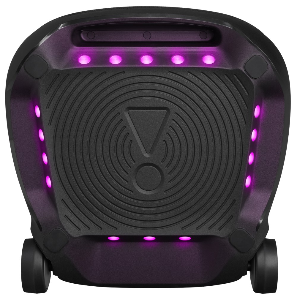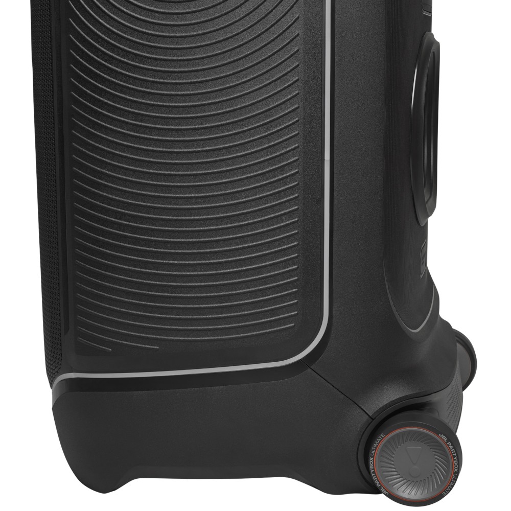 متاسفانه اسپیکر جی بی ال PartyBox Ultimate جزو اسپیکر های قابل حمل نیست و باتری داخلی ندارد. برای استفاده از این محصول باید آن را از طریق کابل برق AC به پریز برق متصل کرده و دکمه پاور را بزنید تا اسپیکر روشن شود؛ بنابراین این بلندگو در مکان هایی که به برق دسترسی نداشته باشید، عملا قابل استفاده نیست مگر در شرایط خاص که بتوانید برق مورد نیاز خود را محیا کنید. پشت اسپیکر، در قسمت پایین پورت های ورودی و خروجی، یک محفظه مخصوص برای کابل برق تعبیه شده است که شما می توانید کابل برق مذکور را در آن محفظه قرار داده و از گم شدن آن جلوگیری کنید. محصول پیش روی شما دارای 1 عدد دستگیره و 2 عدد چرخ می باشد تا شما راحت تر بتوانید آن را جا به جا کنید. این اسپیکر حدودا 40 کیلوگرم است و حمل و نقل آن با توجه به وزن سنگینی که دارد آسان نیست. اما وجود دستگیره و چرخ در این محصول کار را آسان تر خواهد کرد.