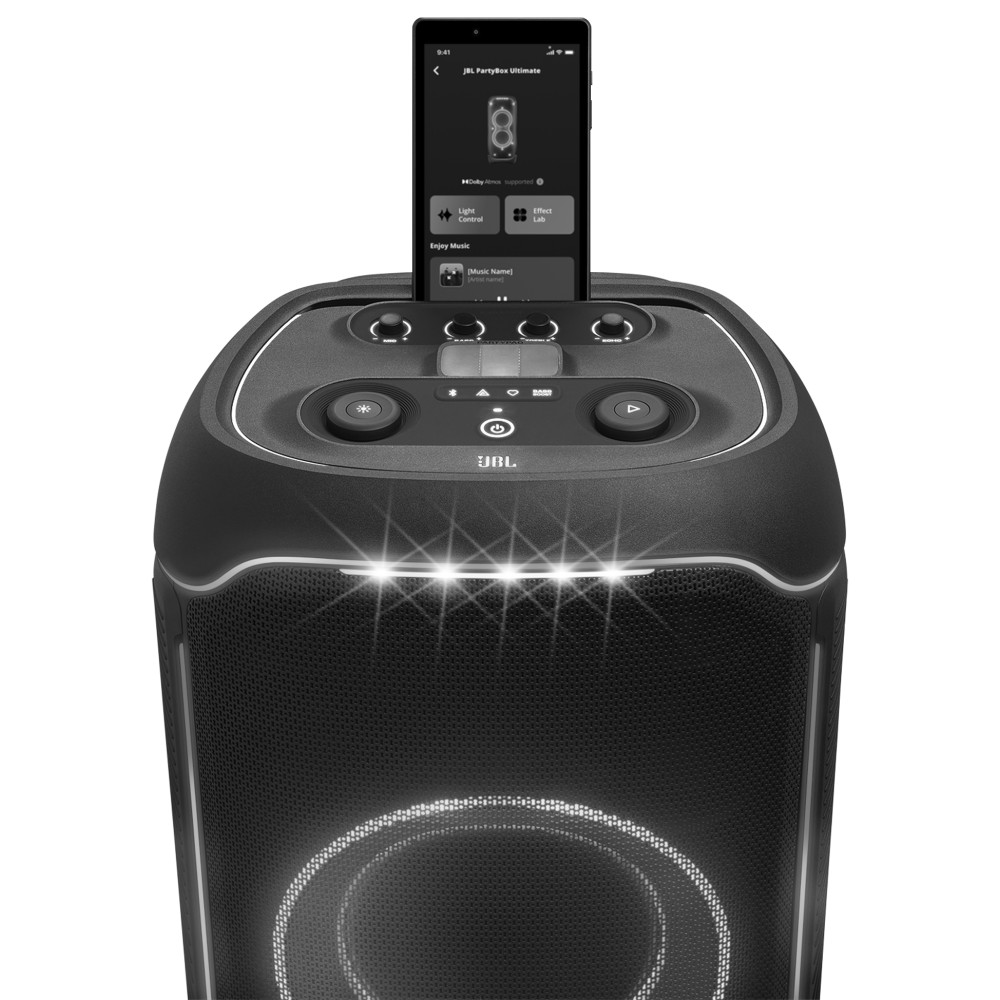 اسپیکر یا بلندگوی جی بی ال PartyBox Ultimate دارای طراحی شیک و زیبایی می باشد. جنس بدنه این محصول از پلاستیک فشرده است و قسمت توری مانند جلویی آن از جنس فلز می باشد. لوگوی این شرکت نسبت به سال گذشته دستخوش تغییراتی شده و عبارت JBL به صورت بزرگ در وسط بلندگو درج شده است. محصول فوق دارای کنترل پنل با دکمه های فشاری، چرخی و لمسی می باشد و کار کردن با آنها بسیار آسان است. در قسمت بالایی کنترل پنل یک محفظه مخصوص برای قرارگیری موبایل وجود دارد. اسپیکر مذکور تنها در حالت ایستاده قابل استفاده است و نمی توانید از آن در حالت خوابیده استفاده کنید. این محصول از کلاس ضد آب IPX4 برخوردار است. IPX4 به معنی آن است که این اسپیکر در برابر پاشیده شدن آب مقاوم است و به طور کامل ضد آب نیست. همچنین در بخش پورت های ورودی و خروجی یک کاور تعبیه شده که از نفوذ آب به داخل اسپیکر جلوگیری می کنید.