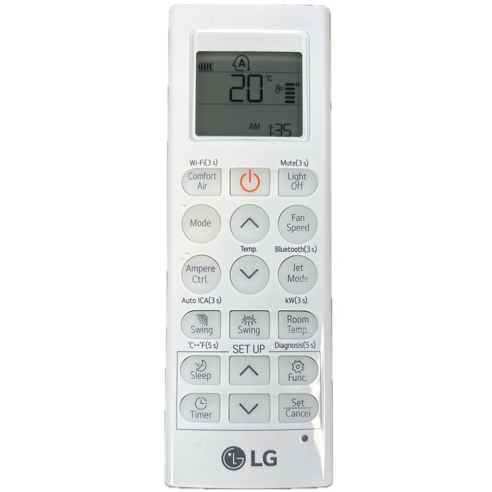 اسپلیت سرمایشی گرمایشی ال جی BMPU26T4 همراه با یک ریموت کنترل به بازار معرفی شده است که با استفاده از آن میتوانید کولر گازی را از راه دور مدیریت کنید. تعدادی دکمه بر روی ریموت قرار داده شدهاند که هر کدام دارای کارایی متفاوتی میباشند و باعث میشوند تا استفاده از کولر گازی راحت و آسان شود. به کمک دکمه SWING میتوانید جهت حرکت دمپر یا پرهها را تغییر دهید در واقع این گزینه امکان تغییر جهت وزش باد را در اختیار شما قرار میدهد. این محصول دارای دریچههای عمودی و افقی میباشد که به کمک کلید Swing عمودی و کلید Swing افقی میتوانید جهت حرکت آنها را تنظیم کنید. حالت Sleep که حالت خواب میباشد دما و سرعت پرتاب باد جهت به وجود آمدن محیطی مناسب برای خواب به صورت خودکار در سطح معینی تنظیم میشود. دکمه Comfort Air هم برای تنظیم خودکار زاویه پرتاب باد و جلوگیری از وزش مستقیم باد به افراد مورد استفاده قرار میگیرد. برای تنظیم یا لغو عملکردهای ویژه و تایمر میتوانید از دکمه Set/cancel استفاده نمایید. دکمه Fan Speed برای انتخاب سرعت حرکت فن و پرتاب باد در اتاق کاربردی میباشد. این کولر گازی دارای حالت Jet است که شامل 3 قابلیت مختلف برای سرد کردن سریع (Jet Cool)، گرم کردن سریع (Jet Heat) و رطوبت زدایی سریع (Jet Dry) میباشد. دکمه Room Temp برای نمایش دمای اتاق به کمک سنسور ترمیستور را هم میتوانید بر روی ریموت کنترل این محصول ملاحظه نمایید.