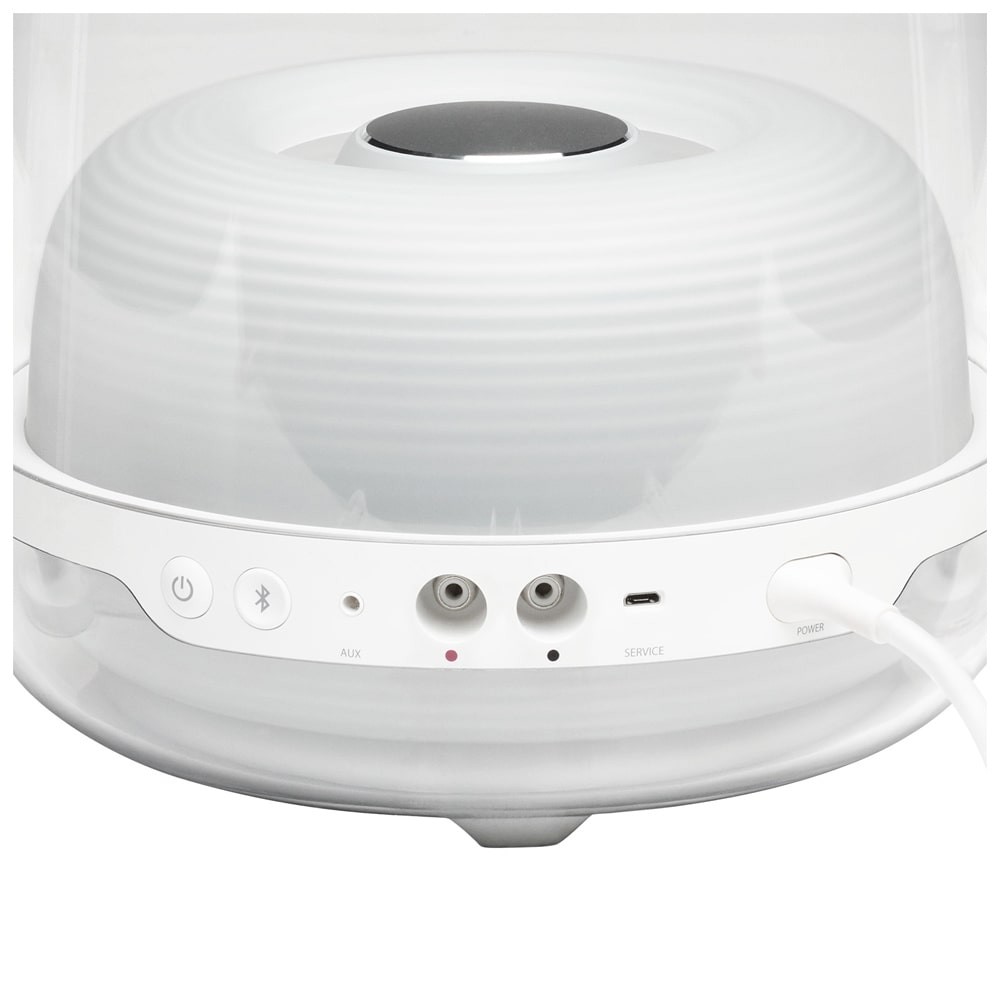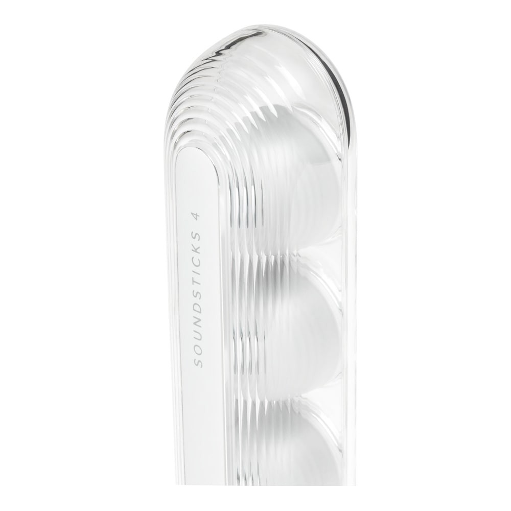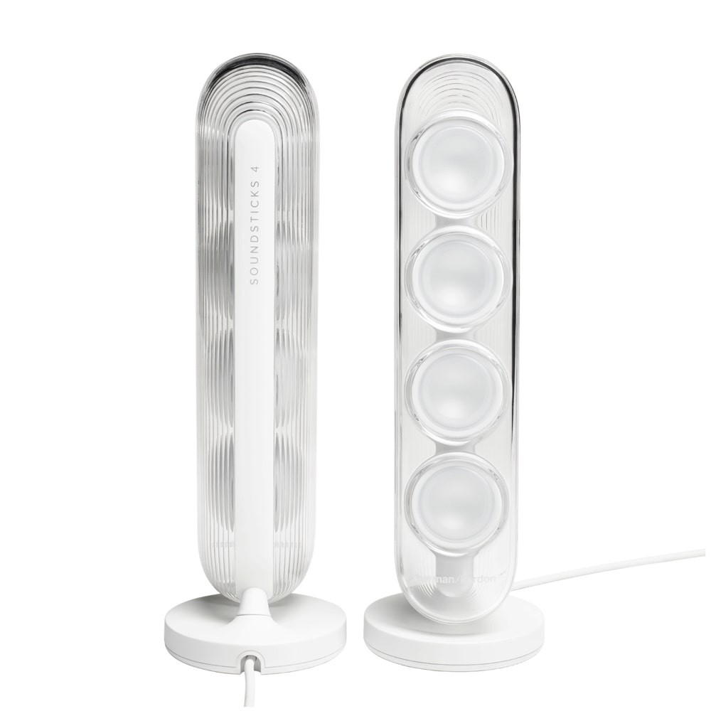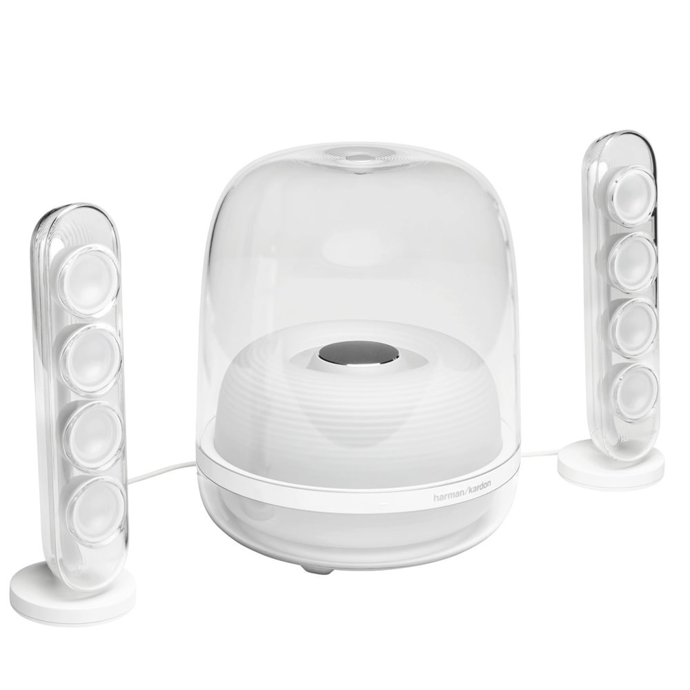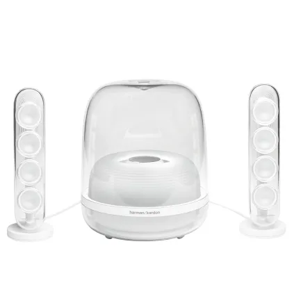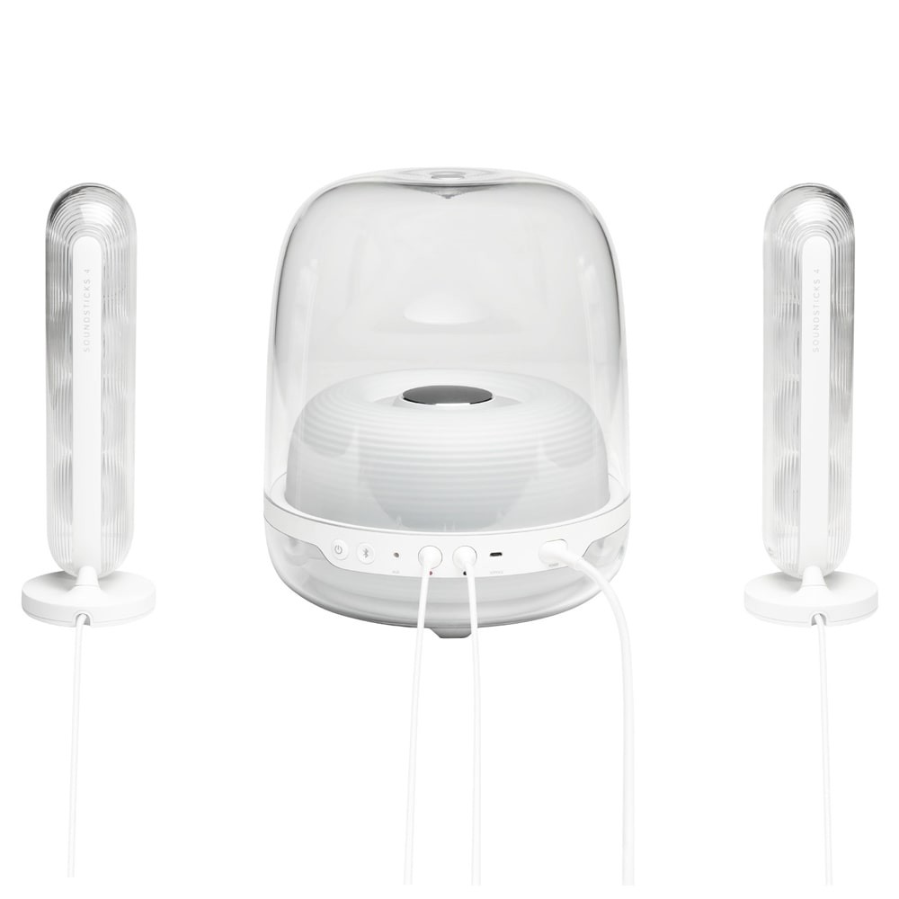 اسپیکر هارمن کاردن SOUND STIICKS4 یکی دیگر از بلندگوهای بلوتوثی قابل حمل هارمن کاردن است که طراحی درجه یک را با عملکرد صوتی قدرتمند و عالی ترکیب می کند. در واقع هارمن کاردن جدیدترین نسخه ی SOUND STIICKS4 را در سال 2020 منتشر کرده است و طراحی خارجی محصول را با حرکت بلندگوهای ماهواره ای به درایورهای پلاستیکی شفاف سفید و پایه های کوچکتر باز طراحی شده نشان می دهد. Harman Kardon SoundSticks 4 که توسط علاقه مندان پرشور صدا در سراسر جهان به عنوان یک اثر هنری واقعی مورد توجه قرار می گیرد، سیستمی خیره کننده است که فضای شما را با صدای سه گانه پر جنب و جوش و بیس باورنکردنی پر می کند. شما می توانید با داشتن این محصول ظاهر و صدای زندگی خود را متحول کنید و موسیقی را به روشی جدید و استثنایی تجربه کنید. با پشتوانه چندین دهه تخصص مهندسی شما می توانید همراه با این محصول طراحی نمادین و صدای استثنایی را کشف کنید و از بیس غنی و مداوم ساب ووفر گنبدی چشمگیر لذت ببرید. علاوه بر ساب ووفر گنبدی شکل این محصول همچنین دارای دو عدد بلندگوی ماهواره ای می باشد که هر کدام دارای چهار درایور هستند تا صدایی پر جنب و جوش و شفاف داشته باشند. باید گفت که این اسپیکر با داشتن سیستم صوتی 2.1 کاناله و توان کلی 140 وات با هشت مبدل تمام برد و یک ساب ووفر طراحی شده است تا فضای اتاق را با صدای بسیار شفاف پر کند و شما را در صدای موسیقی های دلخواهتان غرق کند. چیزی که اسپیکر هارمن کاردن SOUND STIICKS4 را بسیار نمادین کرده است طراحی ساب ووفر و بلندگوهای آن است. در حقیقت اجزای این اسپیکر به صورت کاملا شفاف طراحی شده است بنابراین شما می توانید عملکرد داخلی بلندگوها را مشاهده کنید. به جرات می توان گفت، تعداد کمی از بلندگوها می توانند به اندازه اسپیکر هارمن کاردون SoundSticks4 جلب توجه کنند. باید گفت که این بلندگو تفاوت چندانی با نسل های قبلی خود ندارد و همان ویژگی های طراحی را می توان در این دستگاه نیز مشاهده کرد. این اسپیکر با طراحی گنبد شفاف و شیک به طور یکپارچه با دکوراسیون شما ترکیب می شود. دو بلندگوی ماهواره ای و پوشش ساب ووفر با طراحی سطح موج دار داخلی که زیبایی موسیقی را منعکس می کند خیره کننده به نظر می رسند. در واقع این اسپیکر که بیشتر به عنوان یک اثر هنری واقعی توسط علاقه مندان به صدا در سراسر جهان تلقی می شود، یک سیستم بلندگوی خیره کننده است که فضای شما را با سه صدای پر جنب و جوش و بیس باورنکردنی پر می کند. این سیستم دارای دو بلندگوی ماهواره ای 20 واتی با چهار درایور 1.4 اینچی با برد کامل است و یک ساب ووفر که شبیه یک سفینه فضایی است. بلندگوهای ماهواره ای برج های بلندی هستند که در اطراف ساب ووفر قرار می گیرند. هر کدام از بلندگوها بر روی یک پایه ی دایره ای شکل قرار گرفته اند که به آن ها کمک می کند در حالت قائم بایستند. ساب ووفر نیز با درایور بزرگ 5.25 اینچی خود قابل توجه است. شما می توانید این محصول را بر روی میز، قفسه و یا تقریبا هر جایی که مورد نظر شماست و برای قرار دادن بلندگو مناسب است قرار دهید و به خوبی با دکوراسیون خانه ی خود ترکیب کنید. همچنین به دلیل وزن سبکی که دارد به راحتی می توانید آن را حمل و جابه جا کنید. شکل گنبد ساب ووفر صرفاً برای ظاهر شیک و مدرن آن نیست، بلکه کاربردی نیز هست. یکی از نکات برجسته این اسپیکر بدون شک شکل گنبدی شفاف همراه با بلندگوهای برج مانند آن است. این در حالی است که برخی فکر می کنند که بلندگوها باید بزرگ، و مربعی شکل و حجیم باشند تا خوب به نظر برسند، اما در واقع اینطور نیست. دکمه های کنترلی بسیار کمی در این اسپیکر تعبیه شده اند. در قسمت پشت اسپیکر، یک دکمه ی روشن و خاموش کردن، یک دکمه برای اتصال بلوتوث، یک پورت ورودی 3.5 میلمتری، اتصالات RCA برای کابلهای سیمکشی بلندگوهای چپ و راست و یک پورت سرویس USB و یک اتصال برای آداپتور برق همراه نیز وجود دارد. راه اندازه و استفاده از SoundSticks4 ساده است.همانطور که گفتیم یک دکمه بلوتوث اختصاصی با نسخه ی 4.2 در پشت ساب ووفر وجود دارد که 