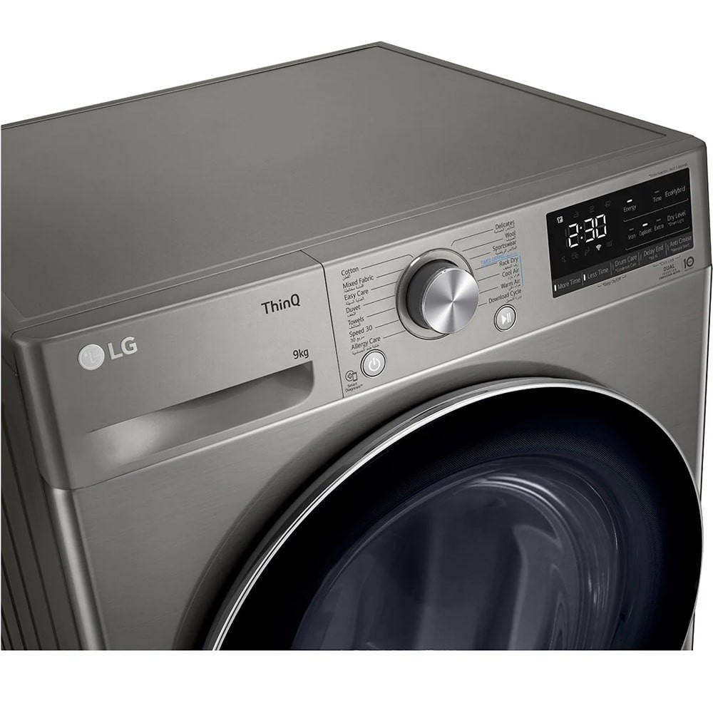 قابلیت Dry Level از دیگر آپشنهای موجود در خشک کن ال جی RH90 میباشد که این به شما را امکان میدهد سطح خشکی را برای خشک کردن البسه انتخاب کنید میتوانید آن را در حالتهای مختلف از جمله مختلف Iron و Extra انتخاب کنید تا با توجه به جنس و ضخامت لباسها فرآیند خشک شدن به بهترین نحو انجام شود. از قابلیتهای جالب و بسیار کاربردی در این خشک کن میتوان به قابلیت Anti Crease برای جلوگیری از ایجاد چین و چروک در لباسها اشاره نمود، اگر به هر دلیلی نتوانید لباسها را پس از اتمام دور خشک کن از داخل دیگ خارج کنید بهتر است قابلیت Anti Crease را فعال نمایید. عملکرد این قابلیت به این صورت است که پس از پایان برنامه خشک کن وارد عمل میشود. این قابلیت 10 ثانیه لباسها را دوران داده و 5 دقیقه ثابت نگه میدارد. این قابلیت حداکثر به مدت 2 ساعت پس از پایان خشک کردن البسه ادامه خواهد داشت، البته در طول این فرآیند هر زمان که خواستید میتوانید در دیگ را باز کرده و لباسها را خارج نمایید. قابلیت EcoHybrid در این خشک کن 9 کیلویی ال جی این امکان را فراهم میکند تا لباسها با مصرف انرژی کمتر و زمان کمتر خشک شوند.