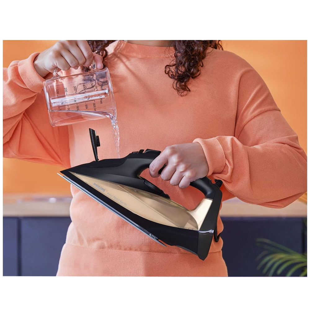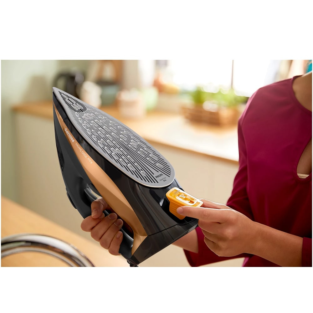فیلیپس برای حداکثر راحتی، این اتو دستی را به سیم بلند 2 متری مجهز کرده است که در حین اتو کردن گره نمیخورد و به شما امکان میدهد به هر نقطه از میز اتو برسید. این سیم دارای روکش پارچهای است که البته نمیسوزد و دستگاه را به خوبی نگه میدارد. این اتو بخار دستی فیلیپس نه تنها یک راه حل طراحی عالی است، بلکه یک اتو با کیفیت واقعا خوب است. امکان تنظیم بخار این اتو در دو حالت لحظهای و مداوم وجود دارد. بخار توسط یک کلید مخصوص خارج میشود. برای تمیز کردن اتو از رسوب و هر چیزی که در آن انباشته شده است، میتوانید از دو حالت تمیز شوندگی و رسوب زدایی استفاده کنید. از کنترلهای خارجی میتوان انتخابگر چرخشی تنظیم قدرت را که به طور سنتی در زیر دسته قرار دارد تشخیص داد. در بالای آن کلیدهای بخار، آب پاش و همچنین امکان خود تمیز شوندگی و رسوب زدایی وجود دارد. اتو فیلیپس DST7040 سری 7000 دارای قابلیت Automatic shut-off یا خاموش شدن خودکار است که در صورت عدم استفاده پس از مدت زمان مشخصی اتو را خاموش میکند. اگر اتو را ثابت رها کنید، خود به خود خاموش میشود. روی کفی آن، پس از 30 ثانیه به طور خودکار خاموش خواهد شد و روی قسمت پاشنه آن، پس از 8 دقیقه به طور خودکار خاموش میشود. عملکرد کنترل دمای بالا و تنظیم بخار متغیر در اتو دستی نام برده شده آسان و دقیق است بنابراین شما همیشه دمای مناسب و بخار مناسب برای لباس خود خواهید داشت. همچنین از قابلیت Vertical steam یا همان بخار عمودی بهره میبرد که به شما امکان میدهد لباسها را درست روی چوب لباسی تازه کنید و چین و چروکهای پارچههای آویزان مانند پرده را از بین ببرید بدون اینکه نیازی به میز اتو داشته باشید. در صفحه پیش روی شما امکان مشاهده مشخصات فنی و قیمت اتو بخار دستی فیلیپس DST7040 رنگ مشکی و طلایی وجود دارد. همچنین در صورت تمایل میتوانید از همین صفحه نسبت به خرید این اتو بخار 2800 وات با ارزانترین قیمت، گارانتی معتبر (حتی بدون گارانتی)، ضمانت اصالت و سلامت کالا از فروشگاه سلام بابا اقدام نمایید. در صورتی که تمایل به خرید اتو بخار قویتر با ظرفیت مخزن بیشتر دارید میتوانید اتو بخار فیلیپس DST8041 را تهیه نمایید.