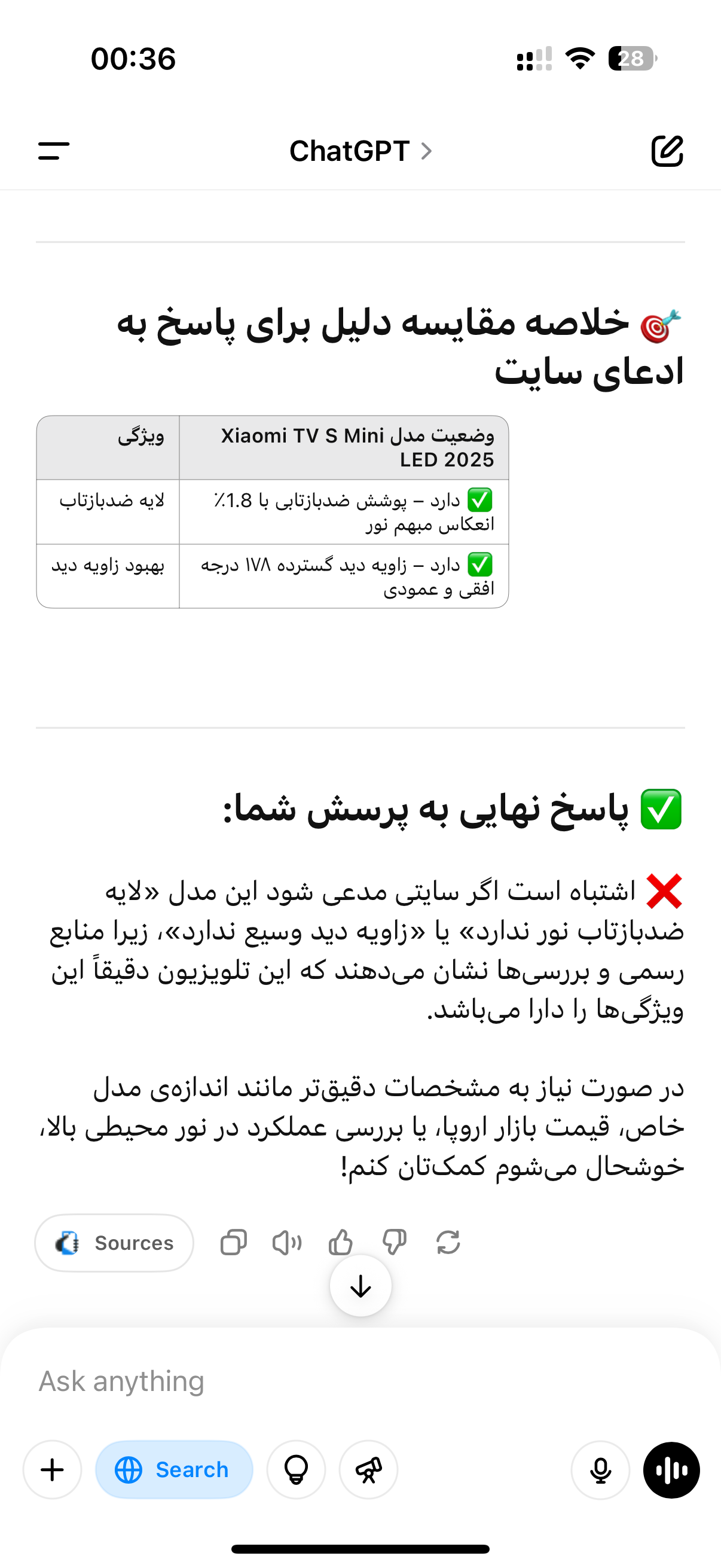 متاسفانه شما این سوال را از ChatGPT پرسیده اید و اینطور که مشخص است مبنای ادعای شما نیز همین است. همانطور که احتمالا می دانید این ابزار هوش مصنوعی در پاسخ های خود اشتباهات بسیار زیادی دارد، به خصوص در زمینه تلویزیون ها! برای مثال یک نمونه همین زاویه دید 178 درجه ای است که این ابزار به اصطلاح هوشمند اما در عمل نادان اعلام نموده است، در صورتی که این تلویزیون زاویه دید بسیار محدودتری ارائه می دهد. از طرفی ChatGPT طبق تصویر ارسالی شما با توجه به اطلاعات اشتباه خود اعلام کرده که هر کس ادعا می کند که صفحه نمایش این تلویزیون پوشش ضد انعکاس ندارد، اشتباه می کند که در نوع خود بسیار بامزه است. لطفا در استفاده از ChatGPT کمی منطقی تر باشید و حتما از این ابزار بخواهید که منبع به شما ارائه دهد چون طبق همین عکس ارسالی شما ظاهرا ChatGPT طبق منابع رسمی و بررسی های خیالی خود به این نتیجه رسیده است.