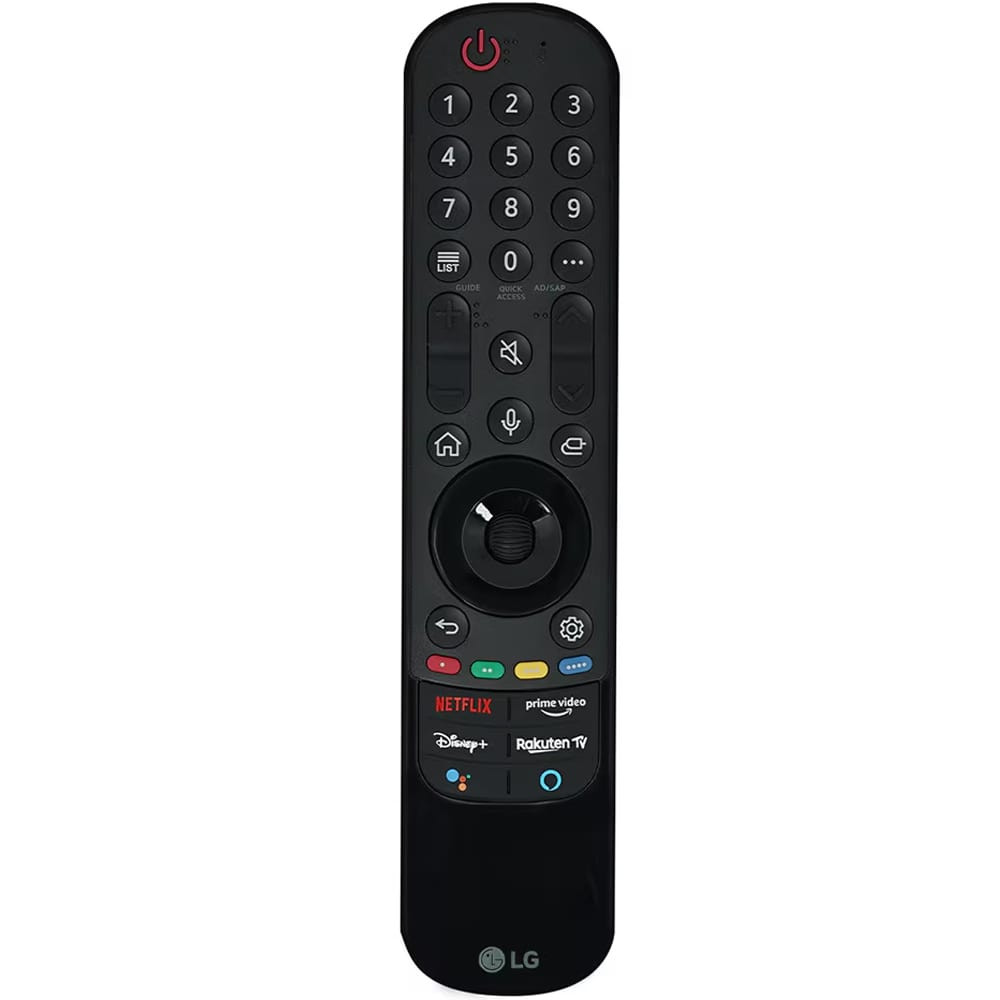 کنترل از راه دور جادویی برای تلویزیونهای ال جی به گونهای طراحی شده است که تجربه شهودی و کاربرپسندتری را ارائه دهد. در اینجا نحوه عملکرد آن آمده است: کنترل از راه دور جادویی از حسگرهای حرکتی استفاده میکند که به کاربران اجازه میدهد مانند ماوس کامپیوتر به صفحه تلویزیون اشاره کنند. این کار با حرکت دادن کنترل از راه دور در هوا، امکان ناوبری آسان در میان منوها و برنامهها را فراهم میکند. همچنین اغلب شامل یک چرخ اسکرول یا ویژگی مشابهی است که به کاربران امکان میدهد به راحتی در لیستها و منوها حرکت کنند و مرور محتوا را آسانتر میکند. بسیاری از مدلها نظیر ریموت کنترل ال جی MR21GC از تشخیص صدا پشتیبانی میکنند و به کاربران اجازه میدهند با استفاده از ورودی صوتی، دستورات صادر کنند یا محتوا را جستجو کنند. کنترل از راه دور معمولا دارای دکمههای اختصاصی برای دسترسی سریع به سرویسهای پخش محبوب (مانند Netflix، Amazon Prime Video و غیره) و سایر عملکردها مانند تنظیمات است. البته ممکن است این سرویسها برای تمام مناطق جغرافیایی در دسترس نباشند. همچنین میتوانید با استفاده از دکمه +Disney به سرویس پخش آنلاین دسترسی سریعی داشته باشید. با فشار دادن این دکمه به کتابخانه بزرگ والت دیزنی از جمله فیلمهای کوتاه، سریالها، مستندها و صدها محتوای بینظیر دیگر دسترسی خواهید داشت. این قابلیت محتواهای بیشمار و تجربه بینظیری را برای شما ارائه خواهد داد (ممکن است برای تمام مناطق جغرافیایی در دسترس نباشد). کنترل از راه دور جادویی اغلب میتواند برای کنترل دستگاههای دیگر، مانند نوارهای صوتی یا پخش کنندههای بلوری، برنامهریزی شود و چندین کنترل از راه دور را در یک واحد ادغام کند. همچنین با پلتفرم webOS ال جی ادغام میشود و امکان ناوبری یکپارچه برنامهها، تنظیمات و ویژگیهای هوشمند را فراهم میکند. دکمه More که نماد سه نقطه روی آن حک شده است، این دکمه را فشار دهید و به منوی کوچکی دسترسی خواهید داشت که عملکرد بیشتری از کنترل از راه دور را نشان میدهد. اگر این دکمه را فشار دهید و نگه دارید، میتوانید توضیحات صوتی (AD/SAP) را روشن کنید. اگر میخواهید دوباره آن را خاموش کنید، میتوانید همان دکمه را برای بیش از یک ثانیه فشار دهید و نگه دارید. دکمه Home؛ این دکمه صفحه اصلی را باز میکند. در این صفحه میتوانید به راحتی بین تنظیمات، منابع متصل، عملکردهای هوشمند و کانالهای تلویزیون سوئیچ کنید. اگر این دکمه را بیش از 3 ثانیه فشار دهید، فهرستی از برنامهها و منابعی که اخیرا باز شده است باز میشود. در قسمت بالای ریموت کنترل میتوانید تعدادی دکمه که شامل عددهای 0 تا 9 است را ملاحظه کنید. با کمک این دکمهها میتوانید به راحتی شبکههای مورد نظر خود را انتخاب کنید و دسترسی سریعی داشته باشید و یا اگر جایی از برنامه و تنظیمات تلویزیون نیاز به وارد کردن عددی باشد میتوانید از این کلیدها استفاده کنید. با استفاده از دکمه (+/- ) هم میتوانید صدا را زیاد و کم کنید. همچنین به کمک دکمهای که دارای دو فلش به سمت بالا و پایین میباشد میتوانید شبکهها را تغییر دهید.