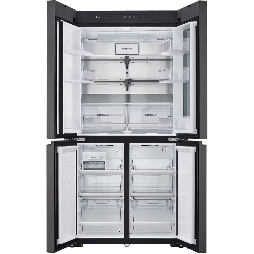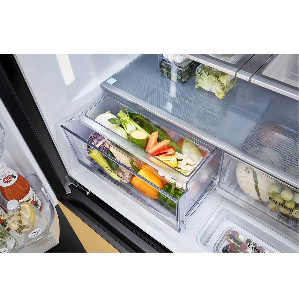 در سمت راست یخچال فریزر ساید بای ساید ال جی GMV960NNME که برای مطابقت با خلق و خوی شما طراحی شده و رنگ را به زندگی شما میبخشد، پنل شیشهای InstaView قرار دارد که بدون زحمت به شما امکان میدهد داخل یخچال را ببینید. به سادگی دو بار به پنل ضربه بزنید و بدون خروج هوای خنک، داخل یخچال را بررسی کنید و از صرفه جویی در انرژی و حفظ دمای داخلی یخچال اطمینان حاصل کنید. InstaView ال جی برای بررسی موارد ضروری مانند نوشیدنیها و تنقلات عالی است. بخش داخلی یخچال دارای چهار قفسه شیشهای است که دوام و پشتیبانی کافی از مواد غذایی سنگین را ارائه میدهد. یکی از این قفسههای Folding shelf یعنی قفسه تاشو است که انعطافپذیری بیشتری را به شما ارائه میدهد و در صورت نیاز، نگهداری اقلام بلندتر مانند بطریها یا ظروف بزرگ را آسانتر میکند. در پایین این قفسهها دو جعبه سبزیجات به نام Big Fresh Zone قرار دارد که به حفظ تازگی و شادابی محصولات شما کمک میکند. همچنین بر روی درب یخچال شش جعبه شفاف برای دسترسی آسان به چاشنیها، نوشیدنیها و اقلام کوچکتر نصب شده است. فریزر در بخش پایین قرار دارد که فضای کافی برای ذخیره سازی مواد غذایی منجمد را فراهم میکند. این بخش فاقد قفسه بر روی درب است و تنها شامل 2 قفسه و 4 کشو میشود. همچنین میتوانید محفظه سیستم یخ ساز دستی با امکان جابجایی (Movable Ice Maker) را مشاهده نمایید که توانایی تولید یخ حبهای (مکعبی) را دارد. برای استفاده باید درب فریزر را باز کرده و یخ را از کشو مخصوص بردارید. این یخچال فریزر ال جی فاقد آبریز و یخریز میباشد. پنل لمسی یخچال هم در قسمت بالای یخچال قرار دارد که با استفاده از آن میتوانید برخی از عملکردهای دستگاه را بررسی و تنظیم کنید.