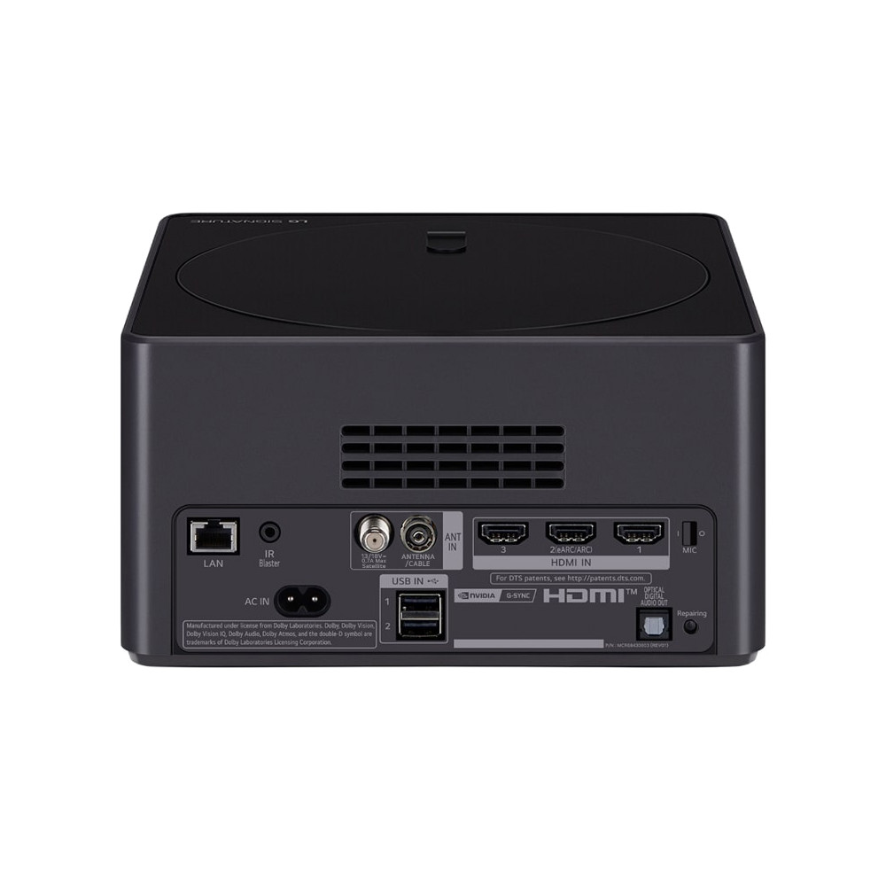 همانطور که پیش تر خدمت شما عرض کردیم، این تلویزیون جزو تلویزیون های بالا رده و لوکس ال جی محسوب می شود که ظاهر شیک و مینیمال و البته طراحی کاملا متفاوتی دارد. تلویزیون 97 اینچ ال جی M4 برخلاف سایزهای کوچک تر خود دارای زبان طراحی Elegant Slim است و مخصوص نصب روی دیوار می باشد. تلویزیون 97 اینچ پیش روی شما تنها 2.82 سانتی متر ضخامت دارد که واقعا عالی است. توجه داشته باشید که در بسته بندی تلویزیون مذکور پایه رومیزی وجود ندارد و ال جی این مدل را به همراه یک پایه دیواری عرضه کرده است که شما به کمک آن می توانید تلویزیون را روی دیوار نصب کنید. پایه دیواری یا براکت دیواری این تلویزیون با سایزهای کوچک تر آن تفاوت دارد و به صورت دو تکه می باشد که در دو طرف بخش بالایی پشت تلویزیون نصب می شوند تا تعادل این تلویزیون غول پیکر را بهتر حفظ کنند. لازم است بدانید که چیزی که تلویزیون پیش روی شما را از سایزهای کوچک تر آن متمایز می سازد، پشتیبانی از پایه یا استند مدل SR-M3DT97 است که شما به کمک آن می توانید تلویزیون را به راحتی هر جایی از خانه نصب کنید. ناگفته نماند که طبق سیاست های ال جی، این پایه داخل جعبه تلویزیون نیست و باید آن را به صورت مجزا خریداری کنید. قاب و حاشیه های سه طرف صفحه نمایش این تلویزیون باریک تر از قاب و حاشیه پایینی آن طراحی شده است تا علاوه بر زیبایی بیشتر، باعث شود تا شما هنگام تماشای تلویزیون تمرکز بیشتری روی محتوای در حال پخش داشته باشید و از تماشای تلویزیون لذت بیشتری ببرید. نکته ای که هنگام نصب تلویزیون فوق متوجه آن خواهید شد، نبود پورت های ورودی و خروجی روی بدنه تلویزیون می باشد. پشت تلویزیون تنها یک ورودی برق تعبیه شده است و هیچ پورت دیگری روی بدنه آن وجود ندارد؛ تمام پورت های ورودی خروجی این تلویزیون روی دستگاه دیگری به نام زیرو کانکت باکس (Zero Connect Box) مدل WM24EA قرار دارند. دستگاه مذکور هیچ ارتباط سیمی با تلویزیون ندارد و نکته جالب و هیجان انگیز آن دقیقا همین موضوع است چون ارتباط این دستگاه با تلویزیون به صورت بی سیم (Wi-Fi) می باشد! بله درست متوجه شدید، دستگاه Zero Connect Box این تلویزیون به کمک فرستنده بی سیم و استفاده از باند فرکانس 60 گیگاهرتز تمامی داده ها و سیگنال های صوتی و تصویری را با بالاترین کیفیت ارسال و از طرف دیگر تلویزیون پیش روی شما به کمک گیرنده بی سیم آن ها را دریافت می کند؛ بنابراین شما باید تمام وسایل و دستگاه های مورد نظر خود را به Zero Connect Box متصل کنید و امکان اتصال مستقیم دستگاه ها به تلویزیون وجود ندارد. این موضوع باعث می شود تا دیگر خبری از کابل های متعدد در اطراف و پشت تلویزیون نبوده یا حتی نیازی نباشد تا کابل ها را در پشت تلویزیون مدیریت و منظم نمایید. دستگاه Zero Connect Box گفته شده دارای ابعاد 230x230x121.7 میلیمتر و وزن 2.4 کیلوگرم است که به شکل یک جعبه مکعب مستطیل مشکی رنگ است اما از نظر وزن نسبت به مدل سال گذشته آن سبک تر شده است. در بالای زیرو کانکت باکس یک صفحه گردان دایره ای شکل برای تنظیم زاویه سیگنال ارسالی به تلویزیون وجود دارد که می توانید آن را به صورت ساعتگرد و پادساعتگرد (چپ و راست) بچرخانید و تنظیم نمایید. علاوه بر آن در بالای Zero Connect Box یک کلید نیز تعبیه شده است که با عقب و جلو بردن آن می توانید زاویه سیگنال ارسالی به تلویزیون را به سمت بالا و پایین نیز تنظیم کنید. ال جی در بالای بدنه دستگاه زیرو کانکت باکس یک نشانگر ال ای دی تعبیه کرده است و به کمک آن متوجه خواهید شد که دستگاه مذکور را در جای مناسبی قرار داده اید و سیگنال ارسالی با قدرت مناسبی به تلویزیون می رسد یا خیر. در صورتی که ال ای ای گفته شده آبی رنگ باشد، یعنی سیگنال قوی و عالی است؛ رنگ سبز نشان دهنده سیگنال خوب؛ رنگ زرد نشان دهنده سیگنال ضعیف و در نهایت رنگ قرمز نشان دهنده قطع شده سیگنال و ارتباط می باشد. علاوه بر آن، یک نشانگر ال ای دی دیگر نیز در جلوی Zero Connect Box وجود دارد که وضعیت خاموش و روشن بودن دستگاه را نشان می دهد. این تلویزیون چون 