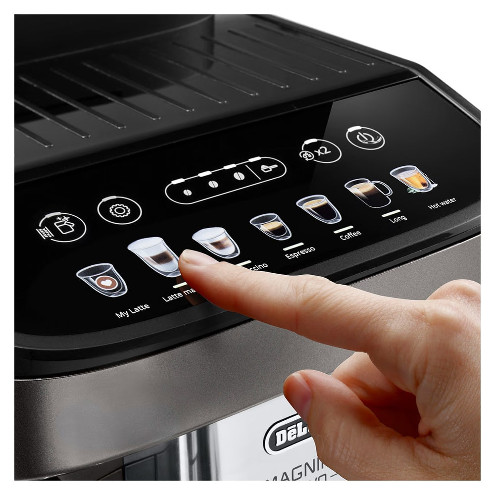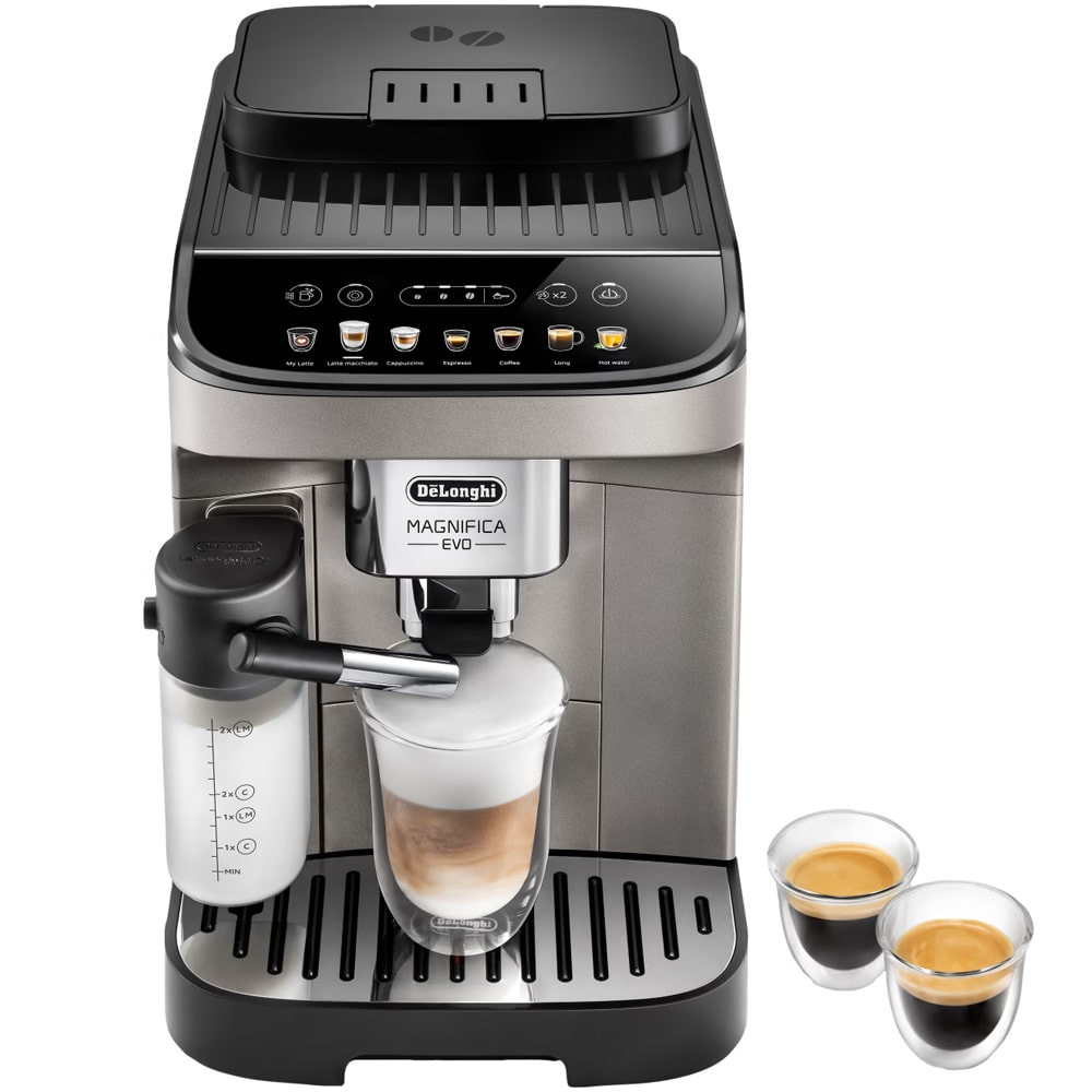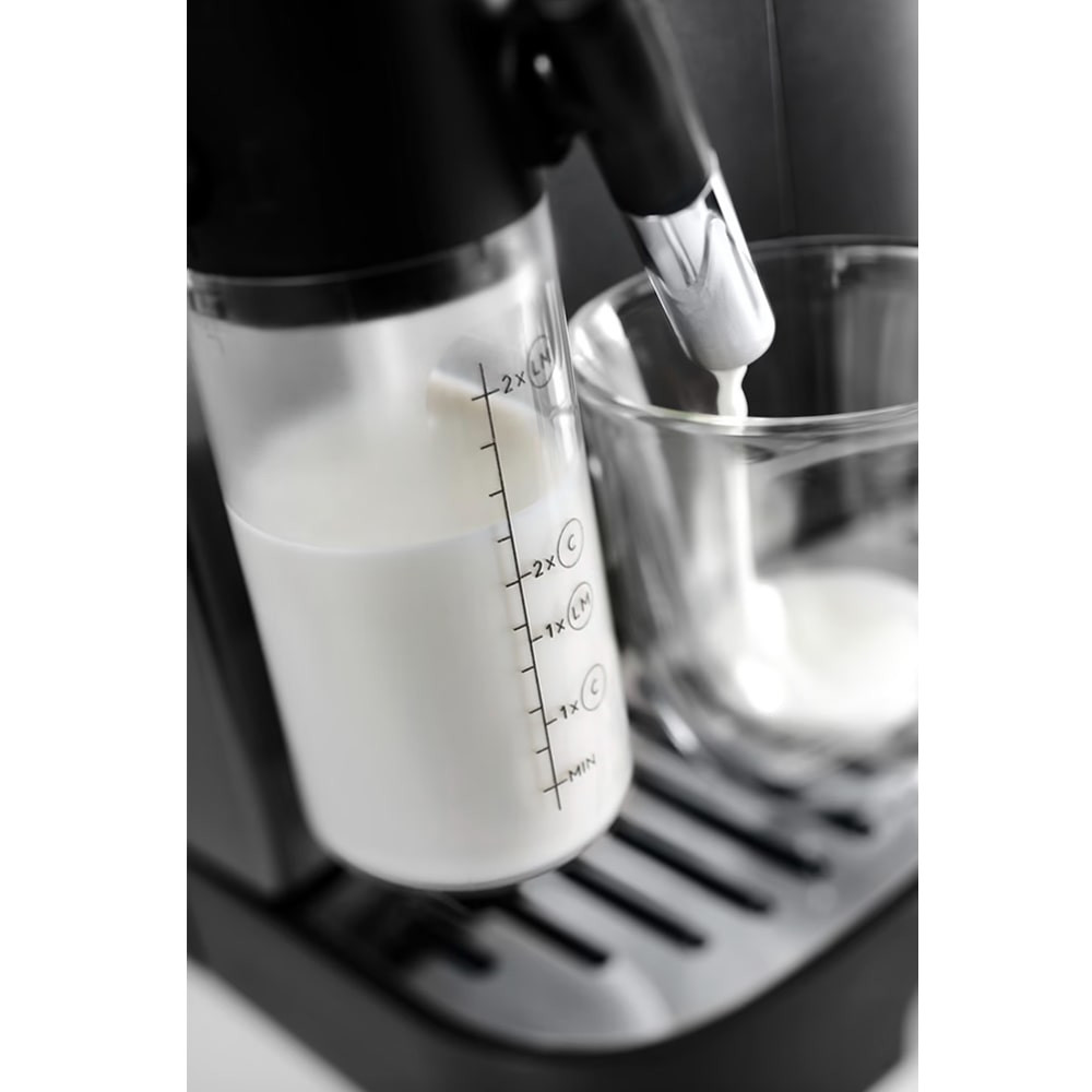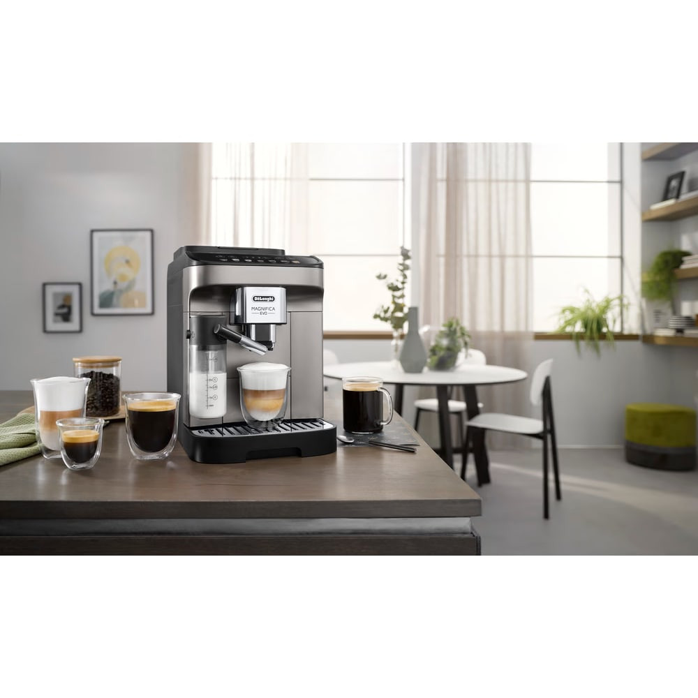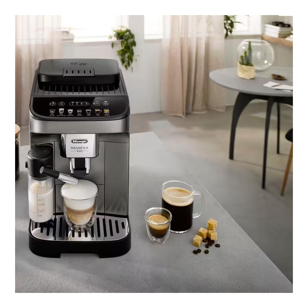Magnifica Evo شامل سیستم LatteCrema ثبت شده De'Longhi است که برای ایجاد کف غلیظ و خامهای برای نوشیدنیهای مبتنی بر شیر مانند کاپوچینو و لاته طراحی شده است. این سیستم نیمه اتوماتیک است: شیر را کف میکند و مستقیما در فنجان شما پخش میکند و نیازی به کف کردن دستی ندارد. همچنین صفحهای وجود دارد که به شما امکان میدهد تراکم کف را تنظیم کنید و به شما امکان کنترل بافت شیرتان را میدهد. یکی از مزایای این سیستم سهولت استفاده از آن است. در اسپرسوساز دلونگی 290.81 یک مخزن شیر بزرگ و قابل جدا شدن تعبیه شده است که برای سیستم LatteCrema استفاده میشود. مخزن شیر این دستگاه قابل جدا شدن است و شما میتوانید به راحتی آن را پر کنید و بعد از استفاده، بهراحتی تمیز کنید. این ویژگی موجب بهبود کارایی و بهداشت دستگاه میشود. همچنین میتوانید آن را در یخچال نگهداری کرد تا شیر تازه بماند. ظرف شیر موجود بر اساس مقدار شیری که باید برای دستورهایی مانند کاپوچینو بریزید برچسب گذاری شده است. سیستم LatteCrema Hot باعث میشود که کف شیر تولید شده به شکلی مطلوب و متناسب با دمای قهوه ایجاد شود تا تعادل مناسبی میان شیر و قهوه برقرار کند. تمیز کردن سیستم کف کردن نیز ساده است، زیرا دستگاه پس از هر بار استفاده به طور خودکار یک چرخه آبکشی را انجام میدهد. با این حال، برای تمیز کردن کاملتر، ظرف و اجزای آن را میتوان به راحتی جدا کرد و شست. این دستگاه دارای دو خروجی است که میتوانید بهطور همزمان دو فنجان اسپرسو یا قهوه دیگر تهیه کنید. این ویژگی برای کسانی که میخواهند سریعتر و بهطور همزمان برای چند نفر قهوه تهیه کنند، بسیار مناسب است.