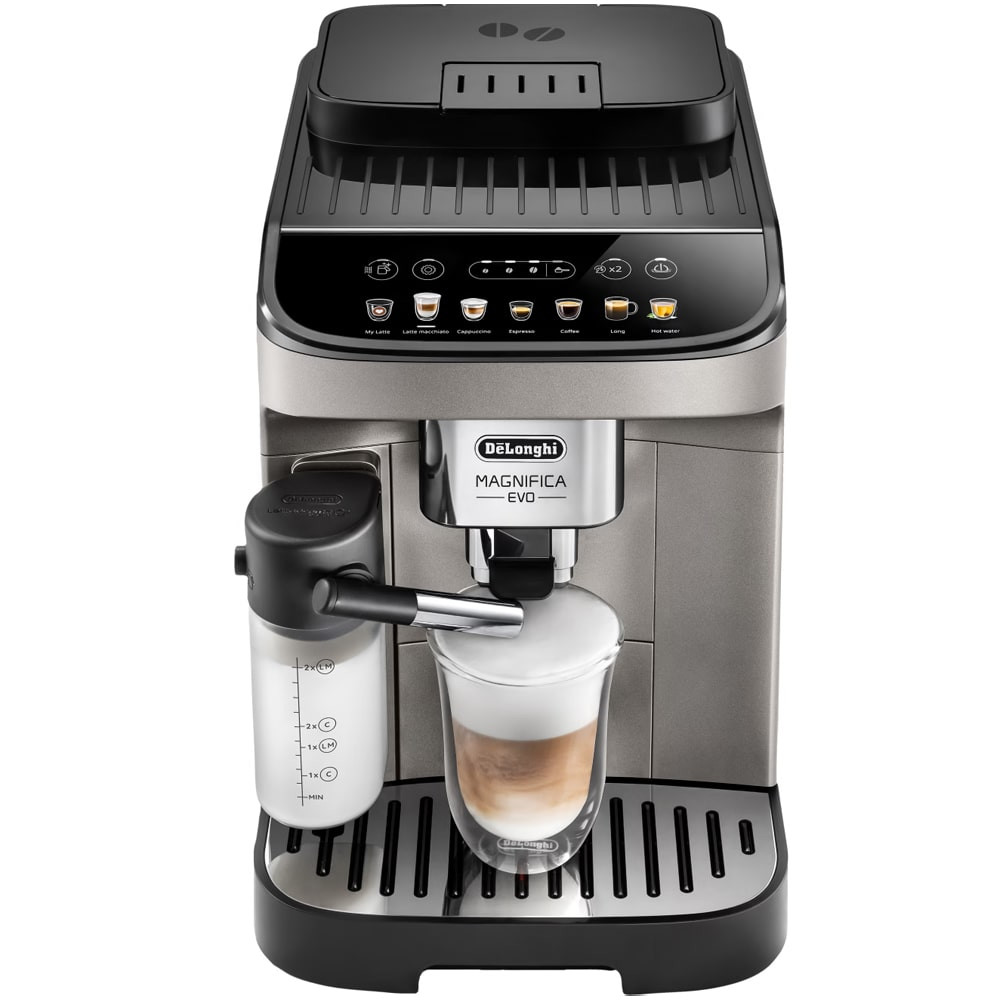 قهوه ساز DeLonghi Magnifica Evo Titan ECAM290.81.TB با طراحی شیک و مدرن خود، بدون دردسر با هر دکوراسیون آشپزخانهای ترکیب میشود. ترکیب کامل تم نقرهای و مشکی قطعا بسیار چشم نواز است و روی کابینت آشپزخانه شما واقعا خوب به نظر میرسد و قطعا ارزش زیبایی شناختی به خانه شما اضافه میکند. این سبک از طراحی ترکیبی از زیبایی شناسی مدرن و مهندسی عملکردی است. این دستگاه با ابعاد تقریبی، عرض 240 میلیمتر، عمق 440 میلیمتر و ارتفاع 360 میلیمتر اندازه جمع و جوری دارد که فضای زیادی را اشغال نمیکند و برای آشپزخانههای کوچک یا آپارتمانها ایدهآل است. کمی بزرگتر از برخی از مدلهای اصلی است، اما با توجه به ویژگیهای آن، اندازه آن قابل توجیه است. نمای بیرونی Magnifica Evo ترکیبی از پلاستیک با کیفیت بالا و فولاد ضد زنگ ساخته شده است. پنل جلویی جایی که بیشتر تعامل در آن اتفاق میافتد در درجه اول از جنس استیل ضد زنگ است که ظرافت و دوام را اضافه میکند و کنارهها و پشت آن از پلاستیک محکم ساخته شدهاند که به نظر مستحکم و خوش ساخت میباشد، De'Longhi موفق شده است که به جای ارزان بودن، احساس برتری به آن بدهد. در واقع همه اجزا به طور یکپارچه در کنار هم قرار میگیرند، و وزن مطمئنی برای دستگاه وجود دارد که از دوام آن صحبت میکند و میتوان گفت کیفیت ساخت کلی قابل توجه است. سینی چکه و سایر قطعات قابل جابجایی به راحتی به داخل و خارج میلغزند، بدون اینکه احساس سستی یا شکستگی داشته باشند. به علاوه، یک صفحه نمایش رنگی بصری در بالای دستگاه با نمادهای رنگی و یک صفحه کنترل لمسی نرم وجود دارد. نمایشگر بازخوردی را در مورد تنظیمات مختلف ارائه میدهد و شما را در هر مرحله از فرآیند راهنمایی میکند و آیکونها و متنهایی را نشان میدهد که عملکرد را حتی برای کاربرانی که برای اولین بار میخواهند استفاده کنند، بصری میسازد. در زیر نمایشگر، یک سری دکمه وجود دارد که مربوط به انواع نوشیدنیهای قهوه است. این دکمهها دارای نور پسزمینه هستند و با نمادهایی برچسبگذاری شدهاند که انتخاب نوشیدنی مورد نظرتان را آسان میکند. بنابراین تنها با لمس یک دکمه میتوانید بدون دردسر از نوشیدنیهای قهوه مورد علاقه خود از جمله اسپرسو، کاپوچینو و لاته لذت ببرید. این امر نیاز به هرگونه آماده سازی دستی را از بین میبرد و آن را به گزینهای مناسب برای صبحهای شلوغ یا پذیرایی از مهمانان تبدیل میکند. از نظر سفارشی سازی، دستگاه به شما امکان میدهد قدرت قهوه، دما و اندازه فنجان را تنظیم کنید. شما همچنین میتوانید تنظیمات دلخواه خود را ذخیره کنید، بنابراین قهوه مورد علاقه شما تنها با فشار دادن دکمه فاصله دارد. دستگاه ترجیحات شما را به خاطر میسپارد، که این ویژگی به راحتی میافزاید، به خصوص اگر افراد متعددی با سلیقههای مختلف از دستگاه استفاده میکنند. مخزن آب در کنار دستگاه قرار دارد و میتواند تا 1.8 لیتر آب را در خود جای دهد. این باعث میشود پس از هر بار استفاده کردن نیازی به پرکردن مجدد آن نباشد و بتوانید چندین دفعه از آن استفاده کنید و قهوههای زیادی را برای خود و دوستانتان تهیه کنید. مخزن شفاف آب قهوه ساز به جای قرار گرفتن در پشت دستگاه همانطور که در اکثر مدلها میبینید، در کنار دستگاه قرار گرفته است که به شما امکان میدهد به راحتی سطح آب را بررسی کنید و دارای دستهای برای برداشتن و پر کردن آسان است. محل نگهداری دانه قهوه Evo در بالای دستگاه قرار دارد، بنابراین اگر به فکر ذخیره آن در زیر کابینتهای دیواری هستید، باید مطمئن شوید که میتوانید به آن دسترسی داشته باشید. این مخزن میتواند 250 گرم قهوه را در خود جای دهد و ظرف تفاله میتواند معادل 14 قهوه را قبل از نیاز به تخلیه در خود ذخیره کند. یکی دیگر از ویژگیهای قابل توجه دهانه قهوه قابل تنظیم است که میتوان آن را بالا یا پایین آورد تا اندازههای مختلف فنجان را در خود جای دهد. اگر بین فنجانهای اسپرسو و لیوانهای بزرگتر جا به جا میشوید، این به ویژه مفید است. دهانه به نرمی حرکت میکند و در ارتفاع مورد نظر محک