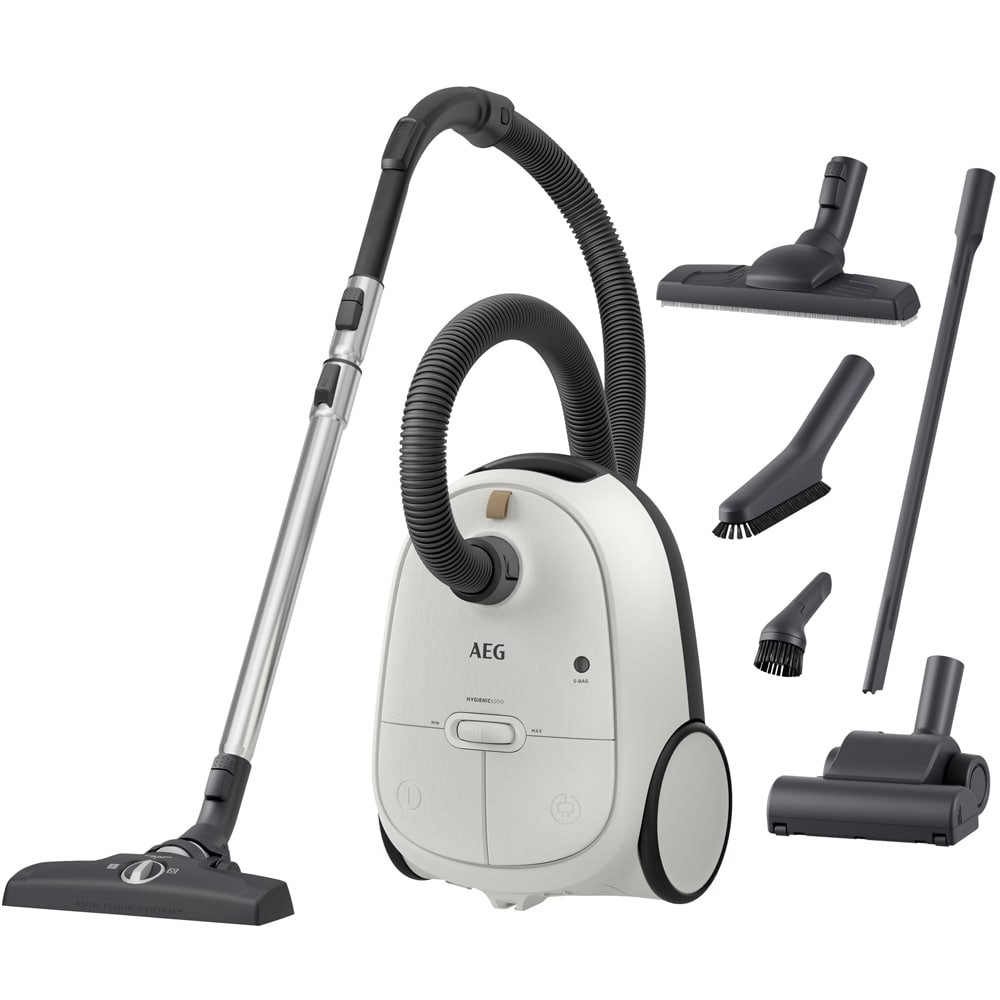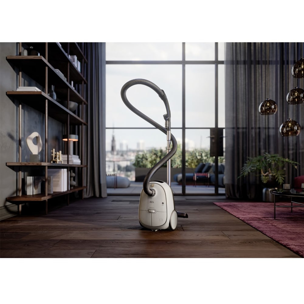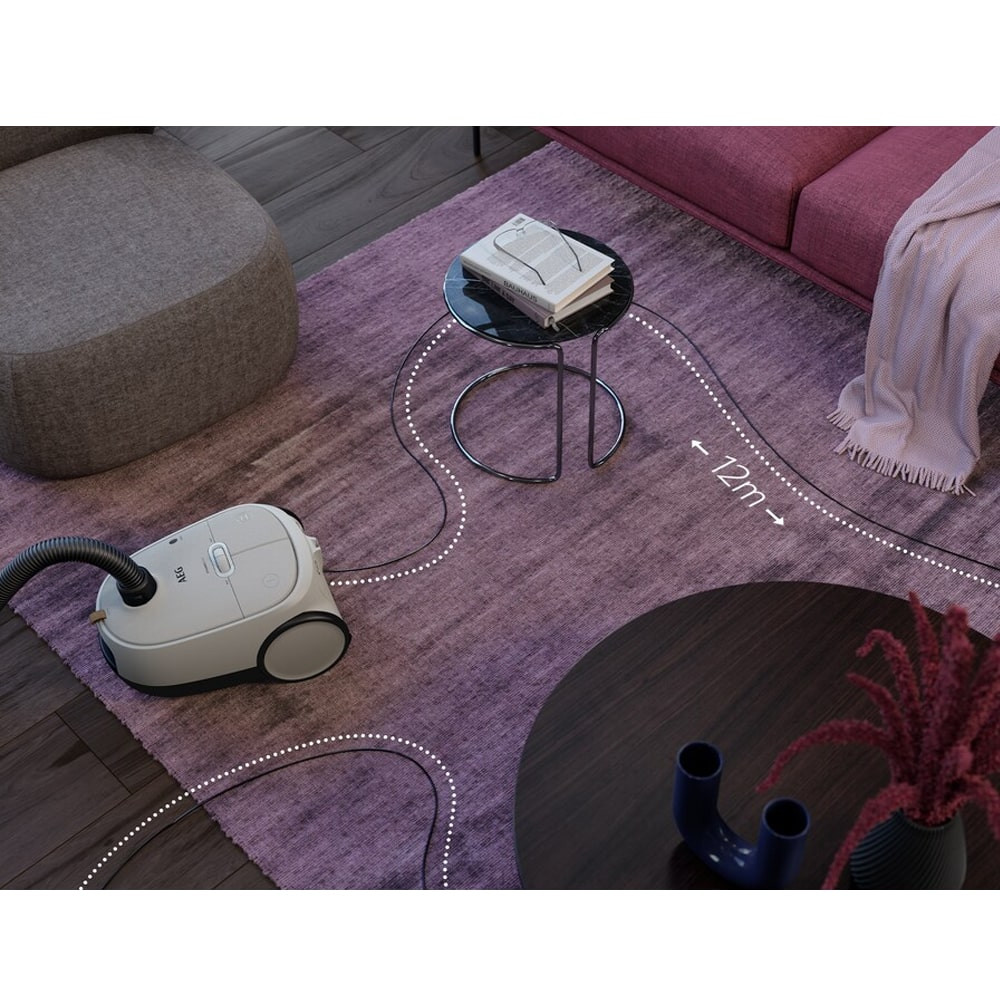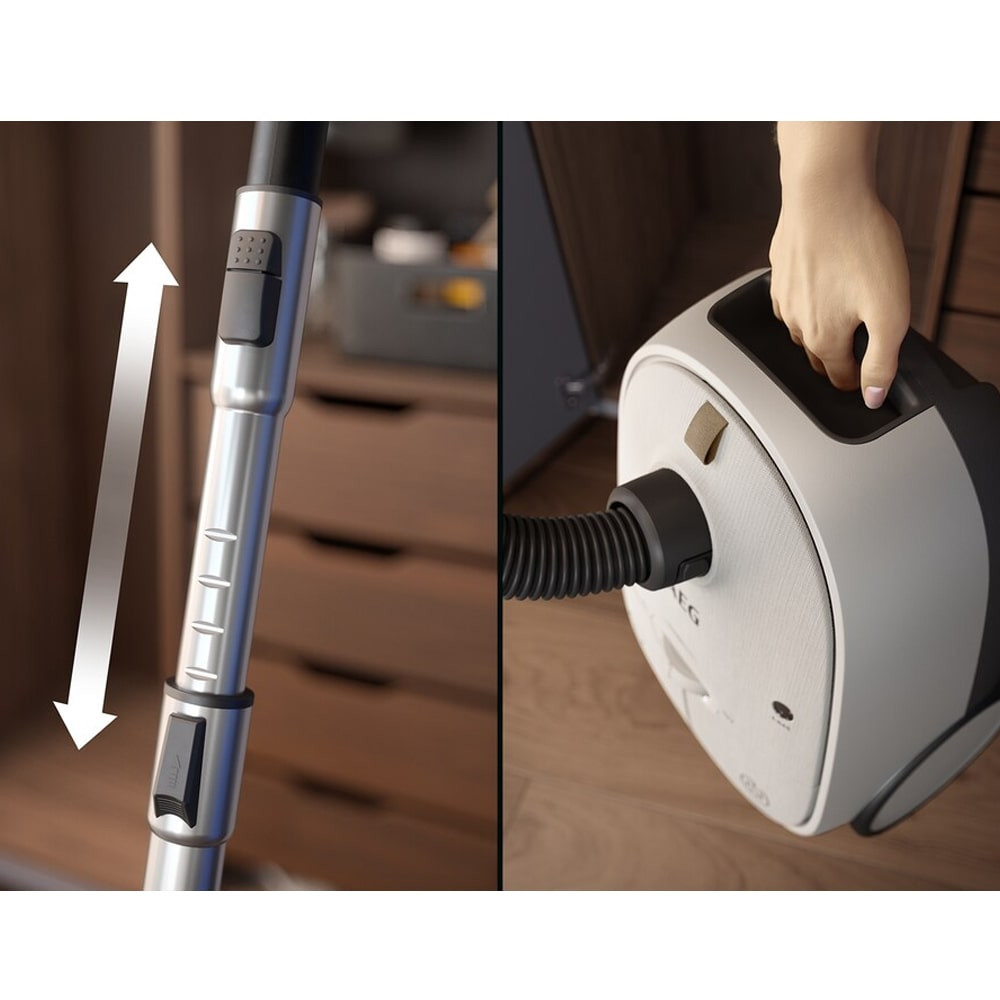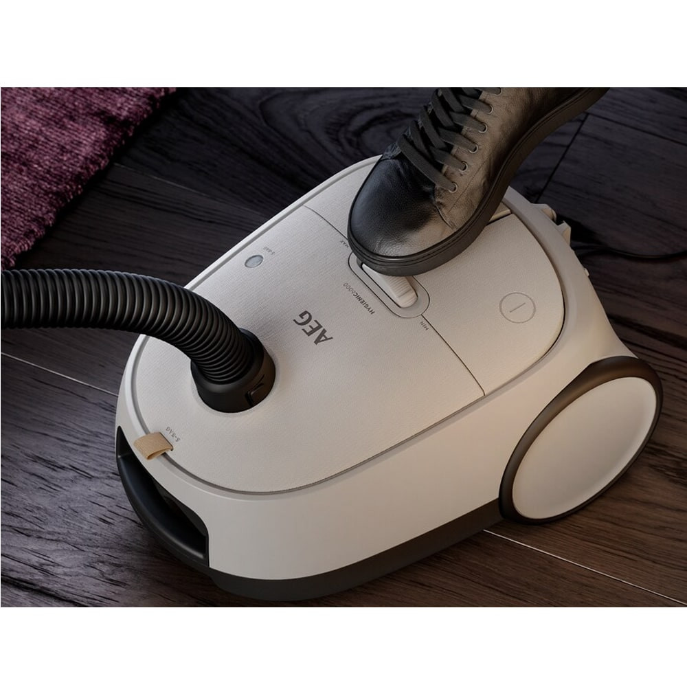 جاروبرقی AEG AB61H6SW دارای طراحی زیبا و نسبتا چشمگیری است. طراحی ساده و ویژگیهای کاربرپسند آن امکان نگهداری آسان را فراهم میکند. این به افزایش طول عمر جارو کمک میکند و تضمین خواهد کرد که همچنان عملکرد مطلوبی را ارائه میدهد. جاروبرقی دارای یک دسته ارگونومیک است که باعث میشود حتی برای جلسات تمیز کردن طولانی مدت در دست گرفتن راحت باشد. دسترسی به کیسه گرد و غبار آسان است و میتوانید به راحتی آن را تمیز نمایید. یکی از ویژگیهای برجسته طراحی این جاروبرقی، لوله تلسکوپی آن است. این ویژگی به شما امکان میدهد طول لوله را متناسب با ارتفاع و نیازهای تمیز کردن خود تنظیم کنید. این انتخاب طراحی متفکرانه تضمین میکند که در حین تمیز کردن نیازی به خم شدن یا کشش غیر ضروری نداشته باشید و فشار روی کمر را کاهش دهید. چرخهای جاروبرقی بزرگ و مستحکم هستند و برای عبور آسان از سطوح مختلف طراحی شدهاند. چرخهای نرم جاروبرقی کمک میکنند تا اطمینان حاصل شود که کفهای شما در حین تمیز کردن آسیب نمیبینند و همچنین باعث میشوند که جاروبرقی سر و صدای کمتری داشته باشد. همچنین وزن نسبتا سبک آن که تنها 7.45 کیلوگرم است، جا به جایی آن را آسان میکند. برخی از کاربران ممکن است جاروبرقی را کمی سنگین بدانند، به خصوص زمانی که آن را از پلهها بالا میبرند. این جاروبرقی از 50 درصد مواد بازیافتی ساخته شده است که آن را به یک انتخاب پایدار تبدیل میکند. به لطف برسها و لوازم جانبی موجود، میتوانید انواع کف را جاروبرقی بکشید. طول سیم برق این جاروبرقی، 9 متر است که تا شعاع 12 متری را برای جاروبرقی کردن پوشش خواهد داد. این سیم به اندازه کافی بلند است و میتوانید به راحتی به اتاقهای مختلف دسترسی داشته باشید بدون اینکه نیازی باشد که دائما سوکت را عوض کنید. دکمه جمع کردن سیم برق و خاموش و روش کردن به صورت پدالهای بزرگی بر روی بدنه دستگاه قرار داده شده است که امکان کنترل کردن آسان آنها حتی با پا فراهم میکند.