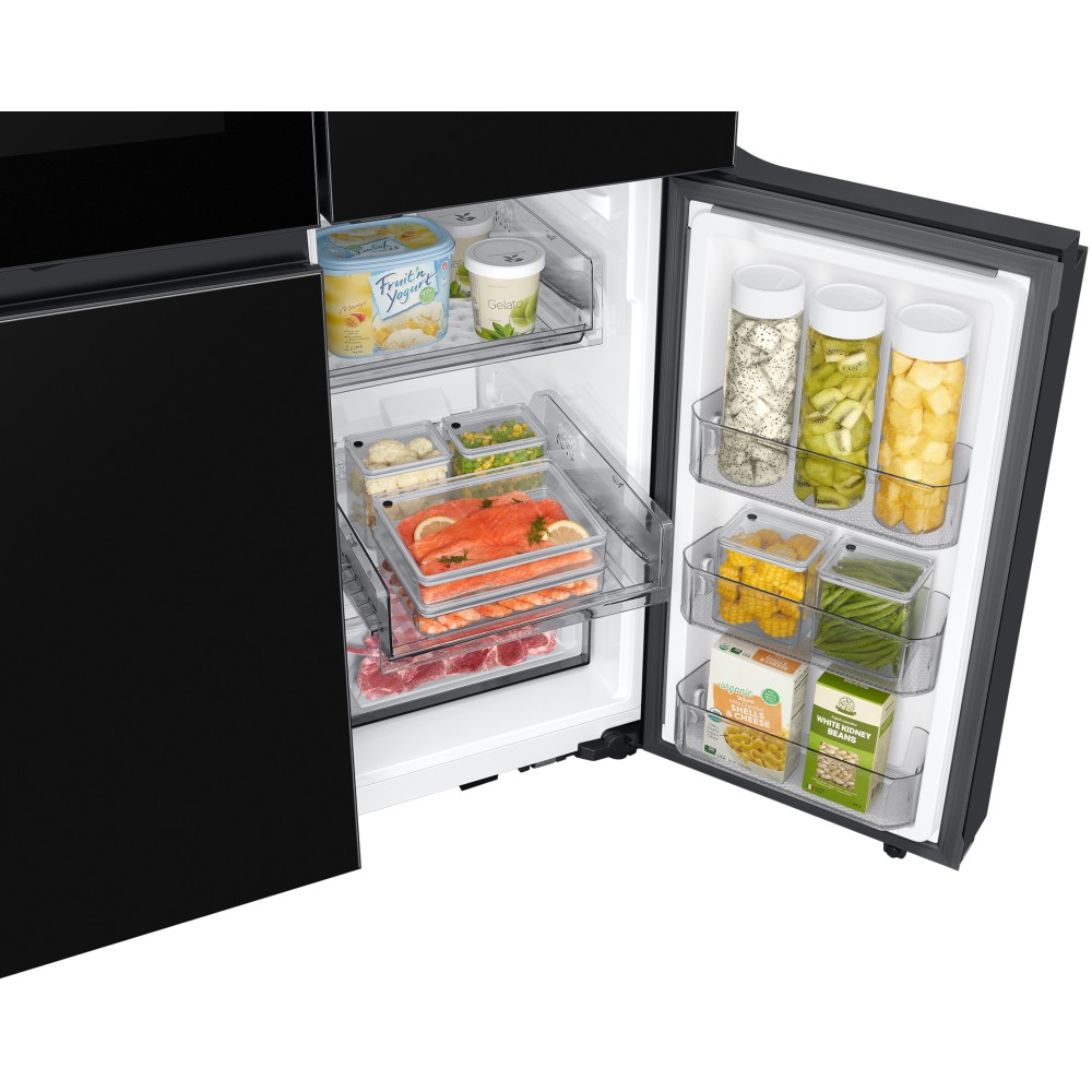 همانطور که پیشتر به آن اشاره کردیم، این یخچال فریزر دارای قابلیت See-thru Door (Welcome Lighting میباشد. عبارت See-thru Door در واقع به درب شیشهای و شفاف سمت چپ بخش یخچال این محصول اشاره دارد. با وجود قابلیت مذکور شما میتوانید برخی اقلام موجود در یخچال را بدون باز کردن درب آن مشاهده کنید. عملکرد این قابلیت به این صورت است که به کمک سنسور حرکتی موجود در زیر درب یخچال، نزدیک شدن شما به یخچال را تشخیص میدهد و یک لامپ در این قسمت روشن میشود و شما میتوانید داخل یخچال را از این طریق مشاهده کنید؛ بهاینترتیب نیازی نیست که هر بار درب یخچال را باز کنید و از هدررفت سرما تا حد زیادی جلوگیری میشود. این درب شیشهای دارای ساختار سه لایه میباشد و از خروج هوای سرد جلوگیری میکند. شما میتوانید قابلیت See-thru Door (Welcome Lighting) را در سه حالت Near (نزدیک)، Default (پیشفرض، به گفته سامسونگ حدود 50 سانتیمتر) و Far (دور) تنظیم کنید. درصورتیکه در عرض 2 ثانیه پس از روشن شدن لامپ درب یخچال را باز نکنید، لامپ بهصورت خودکار خاموش میشود. سامسونگ برای شما این امکان را فراهم کرده تا این قابلیت را از طریق برنامه SmartThings سامسونگ خاموش و روشن کنید.