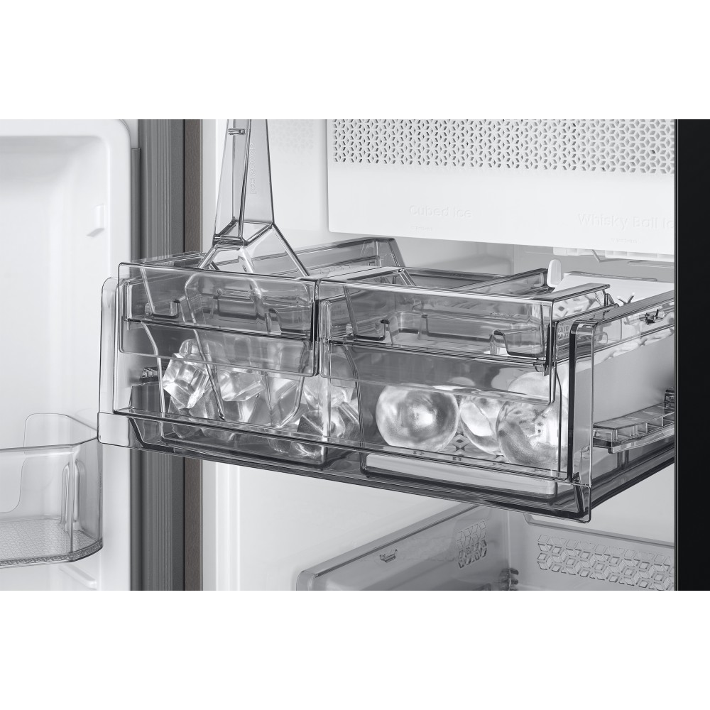 همانطور که پیشتر به آن اشاره کردیم، یخچال فریزر چهار درب سامسونگ RF65DB975E22A دارای سیستم یخساز اتوماتیک دوگانه یا Dual Auto Ice Maker میباشد. سیستم یخساز این یخچال فریزر در اولین کشوی سمت چپ داخل فریزر قرار گرفته است. سیستم یخساز مذکور یخ را به شکل مکعبی و کروی تولید میکند و شما میتوانید به کمک سرتاسی که به همراه این یخچال فریزر در اختیار شما قرار میگیرد، یخ کروی یا مکعبی مورد نظر خود را از محفظه کشویی یخ در فریزر خارج کنید. به گفته سامسونگ، سیستم یخساز اتوماتیک این یخچال فریزر توانایی تولید 3 یا 6 (0.4 کیلوگرم) یخ کروی در هر 24 ساعت را بسته به انتخاب شما دارد اما بهصورت پیشفرض روی تولید 6 یخ کروی تنظیم شده است. به گفته سامسونگ، اگر تعداد یخ کمتری را انتخاب کنید، سیستم یخساز اتوماتیک یخهای شفافتر و شکیلتری را تولید میکند. کشوی نگهداری یخ کروی این یخچال فریزر امکان ذخیره 6 (حدود 0.4 کیلوگرم) عدد یخ کروی را دارد و هنگام پر شدن کشو، بهصورت خودکار تولید یخ کروی را متوقف میکند. همانطور که پیشتر نیز اشاره کردیم، سیستم یخساز اتوماتیک این یخچال فریزر توانایی تولید یخ مکعبی نیز دارد. به گفته سامسونگ، این سیستم یخساز امکان تولید حداکثر 1.2 کیلوگرم یخ مکعبی را در مدت 24 ساعت دارد و کشوی نگهداری یخ مکعبی این یخچال فریزر امکان ذخیره حدود 1.4 کیلوگرم یخ مکعبی را دارد و هنگام پر شدن کشو، بهصورت اتوماتیک تولید یخ را متوقف میسازد. علاوهبر آن، روی پنل کنترلی این یخچال فریزر قابلیت Ice Maker On/Off نیز وجود دارد که میتوانید به کمک آن سیستم یخساز اتوماتیک را خاموش یا روشن کنید.