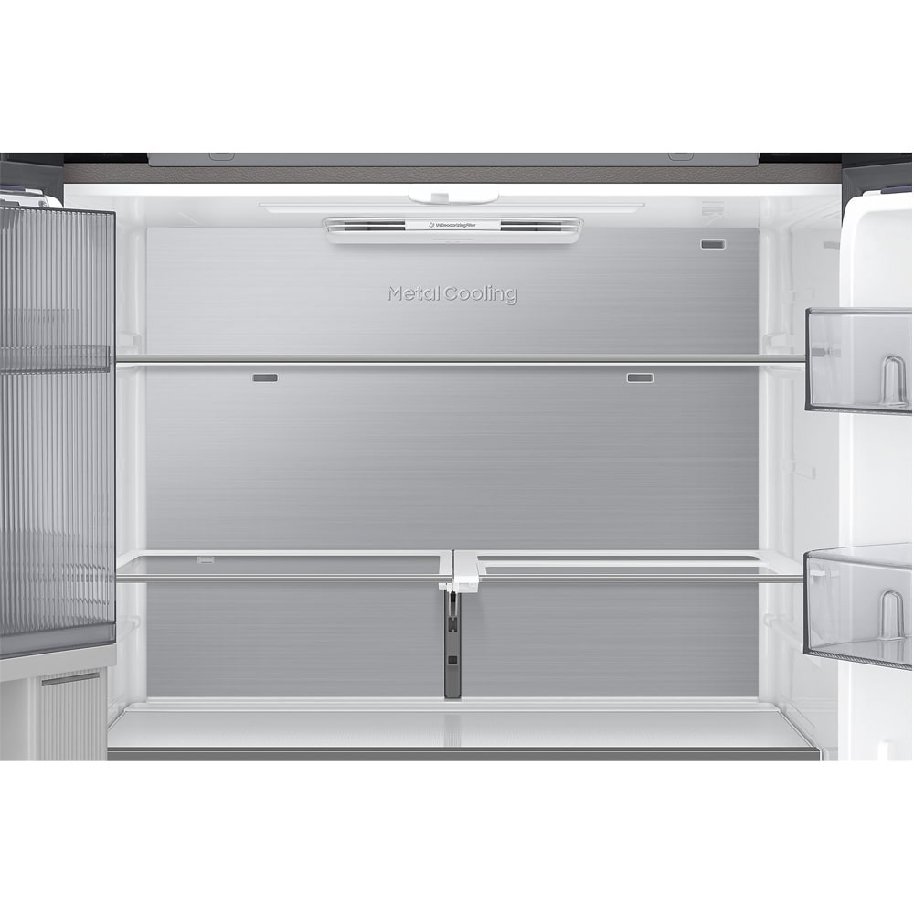 صفحه خنککننده فلزی (Metal Cooling) در دیواره پشتی یخچال فریزر درب فرانسوی (فرنچ) سامسونگ RF65DB975E22 به حفظ دمای داخلی بهینه کمک میکند. این صفحه سرما را حفظ کرده و از هدر رفتن هوای خنک هنگام باز بودن درب جلوگیری میکند. در یخچالهای سامسونگ، کانال خنککننده فلزی که گاهی اوقات صفحه خنککننده فلزی یا خنککننده فلزی نیز نامیده میشود، ویژگیای است که برای حفظ دمای داخلی ثابت و بهینه طراحی شده است. نحوه کار آن به شرح زیر است: این قابلیت باعث پایداری دما میشود در واقع فلز هوای سرد را حفظ میکند و از افزایش سریع دما هنگام باز شدن درب جلوگیری میکند و به بازیابی سریع هرگونه اتلاف گرما هنگام بسته شدن درب کمک خواهد کرد. یکی دیگر از مزایای حضور این صفحه فلزی، خنککنندگی یکنواخت را در سراسر یخچال تضمین میکند و به تازهتر ماندن مواد غذایی برای مدت طولانیتر کمک میکند. حفظ تازگی: با حفظ دمای ثابت، کانال خنککننده فلزی به حفظ تازگی و طعم مواد غذایی کمک میکند. سیستم خنککننده سهگانه (Triple Cooling system) سامسونگ از سه سیستم خنککننده مستقل برای بهینهسازی دما و رطوبت برای یخچال، فریزر و یک منطقه سوم (اغلب FlexZone یا منطقه تازه) استفاده میکند. این امر به جلوگیری از اختلاط بو بین یخچال و فریزر کمک میکند و نوسانات دما را به حداقل میرساند و در نتیجه تازگی و طعم مواد غذایی را حفظ میکند. با وجود این قابلیت هر منطقه سطح بهینه دما و رطوبت خود را حفظ میکند که برای نگهداری انواع مختلف مواد غذایی بسیار مهم است. همچنین با جدا نگه داشتن سیستمهای خنک کننده (سیستمهای خنک کننده سه گانه) از اختلاط بو بین محفظهها جلوگیری میکند و تضمین خواهد کرد که غذا طعم طبیعی خود را حفظ میکند. همچنین نوسانات دما را به حداقل میرساند و به تازه ماندن غذا و حفظ بافت آن کمک میکند.