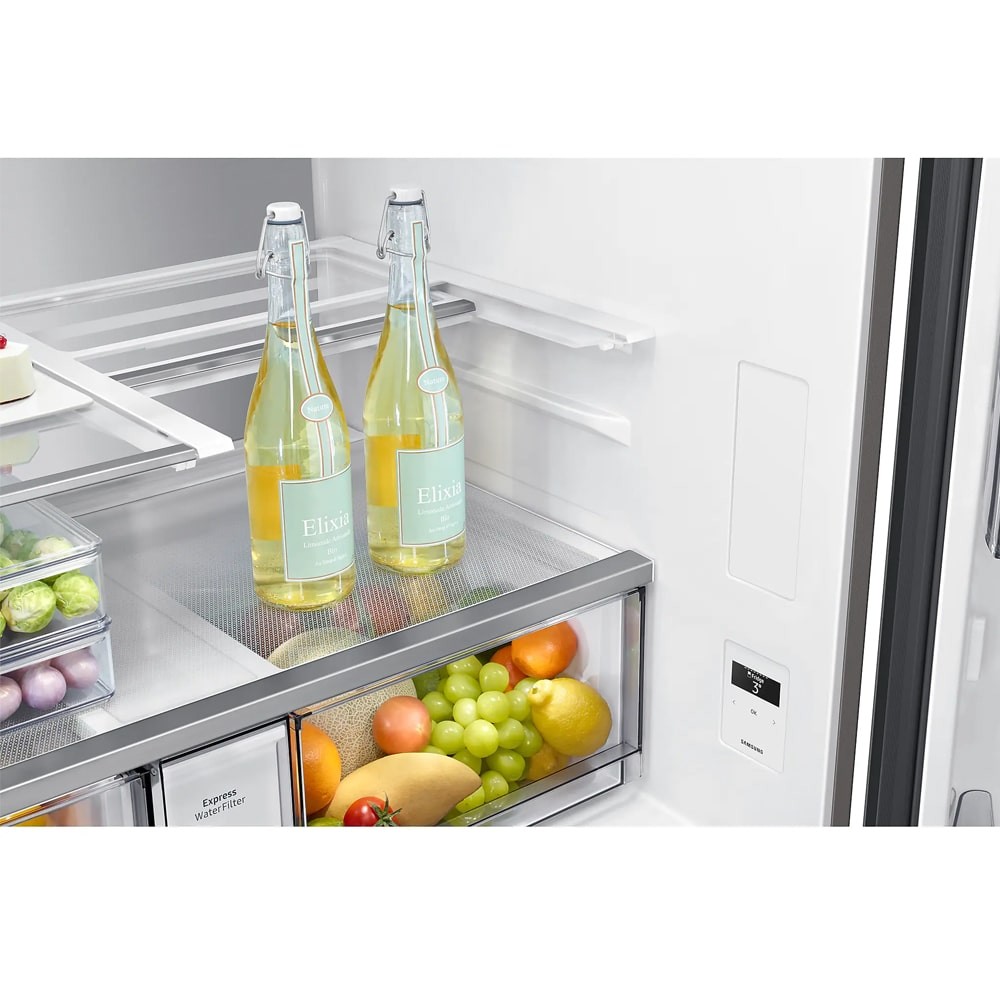 - مناسب برای مناطق جغرافیایی با آب و هوای گرمسیری (Tropical) یا T قابلیت Door Alarm برای اطلاع دادن در صورت باز ماندن درب یخچال دارای صفحه فلزی مخصوص (Metal Cooling) در قسمت داخلی یخچال برای ثابت نگهداشتن و حفظ سرما مناسب برای مناطق جغرافیایی با آب و هوای معتدل (Temperate) یا N قابلیت درب در درب (Food Showcase) برای دسترسی به برخی مواد غذایی بدون باز کردن درب اصلی یخچال و جلوگیری از هدر رفت سرما طبقات یخچال و فریزر از جنس شیشه حرارت دیده سیستم بدون برفک (No Frost) دارای موتور دیجیتال اینورتر (Digital Inverter) با تخمین طول عمر بالا (حدود 21 سال)، صدای کمتر و صرفه جویی در مصرف انرژی دستگیره مخفی (Recess Handle) سیستم یخ ساز اتوماتیک دوگانه یا Dual Auto Ice Maker سیستم خنک کننده سه گانه (Triple Cooling) برای سرمایش مجزای یخچال و فریزر و حفظ تازگی مواد غذایی بوگیر یا Deodorizer جهت جلوگیری از پخش بوی مواد غذایی در یخچال قفسه تاشو Folding Shelf مخصوص نگهداری بطری و ظروف بزرگ استفاده از گاز R600a برای ایجاد سرمایش و سازگاری با محیط زیست قابلیت Power Freeze برای انجماد سریع در فریزر مناسب برای مناطق جغرافیایی با آب و هوای نیمه معتدل (Extended temperate) یا SN عدم استفاده از مواد شیمیایی مضر در ساخت پارچ مخصوص (BPA Free) محفظه FlexZone با قابلیت تنظیم دما در 5 حالت مختلف برای نگهداری بهتر انواع مواد غذایی طراحی شیک و یکپارچه (Built-in Look) جهت هماهنگی بیشتر با کابینت و دکوراسیون آشپزخانه پشتیبانی از اینترنت اشیاء (IoT) برای مدیریت و کنترل یخچال فریزر توسط دستگاههای هوشمند سازگار از طریق شبکه و اینترنت دارای کشوی مخصوص نگهداری میوه و سبزیجات پشتیبانی از برنامه SmartThings برای مدیریت و کنترل یخچال فریزر و سایر دستگاه ها از طریق موبایل هوشمند تضمین عملکرد و کارایی موتور با تکنولوژی Digital Inverter تا 20 سال توسط سامسونگ قابلیت Auto Open Door برای باز کردن خودکار درب یخچال به کمک سنسور هوشمند تشخیص حرکت دارای مرکز نوشیدنی (Beverage Center) برای دسترسی به آب سرد معمولی از طریق آب ریز و پارچ مخصوص نوشیدنی با قابلیت پر شدن خودکار و مخزن اسانس و طعم دهنده یخچال فریزر 4 درب (بالا پایین و ساید بای ساید) قابلیت Power Cool برای سرمایش سریع در یخچال مناسب برای مناطق جغرافیایی با آب و هوای نیمه گرمسیری (Subtropical) یا ST