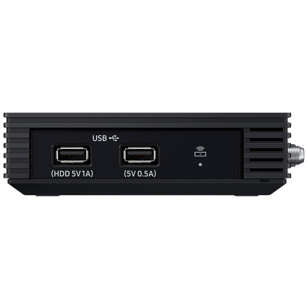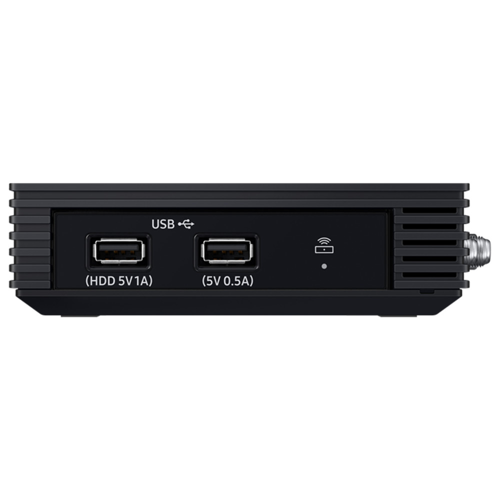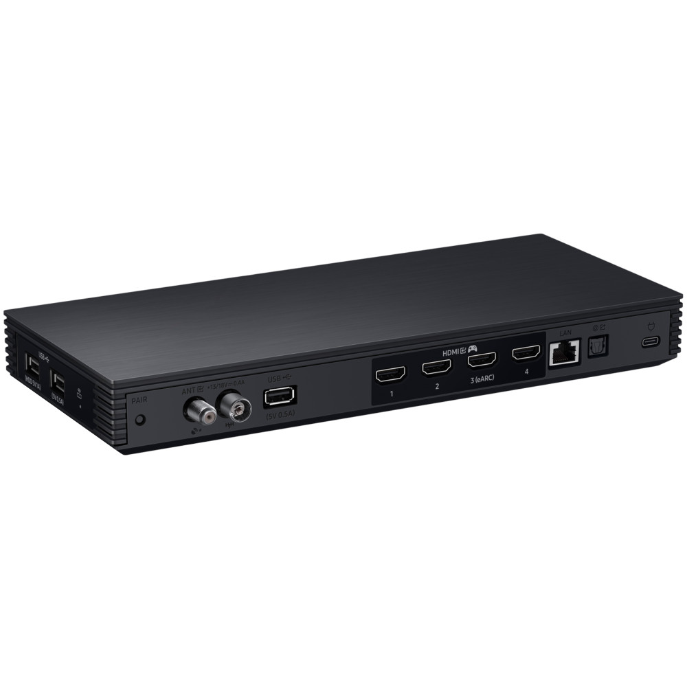 همانطور که پیشتر نیز به آن اشاره کردیم، تقریبا تمامی پورتهای این تلویزیون روی دستگاهی به نام Wireless One Connect Box تعبیه شده و روی بدنه تلویزیون تنها 3 پورت دیده میشود؛ این پورتها شامل یک پورت USB-C، یک پورت Micro HDMI 2.1 که در بخش گیمینگ در مورد آن بهطور مفصل توضیح دادیم و یک پورت ورودی دستگاه Power Box (One Connect Power Box) میباشد که در ادامه به آن خواهیم پرداخت. پورت USB-C مذکور یک پورت 5 ولت 1 آمپر می باشد که طبق گفته سامسونگ برای اتصال دوربین سامسونگ مدل Slim Fit Cam (SlimFit Cam) و همچنین برای اتصال حافظه جانبی یا فلش USB Type-C به تلویزیون مورد استفاده قرار می گیرد اما ما هنوز این موضوع را تست نکرده و مطمئن نیستیم، بنابراین نمی توانیم این موضوع را تایید یا تکذیب کنیم؛ در آینده در صورت امکان این موضوع را تست کرده و اطلاعات دقیقتری را با شما به اشتراک خواهیم گذاشت.
