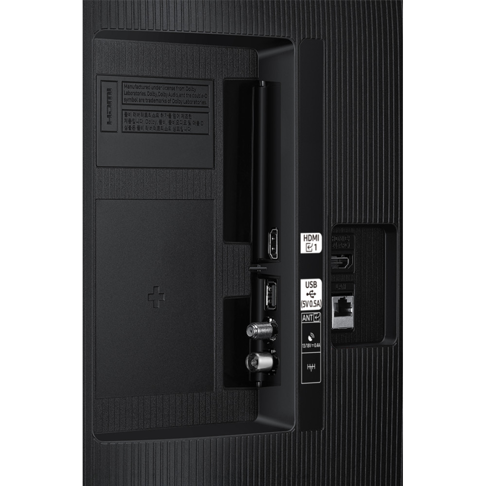 طبق بررسیهای ما، جنس بدنه پشت تلویزیون از پلاستیک میباشد و طراحی آن با هاشورهای منظم از بالا تا پایین پوشانده شده است. همانطور که اشاره کردیم این تلویزیون قابلیت نصب روی دیوار نیز دارد و شما برای نصب آن روی دیوار، نیاز به یک پایه دیواری یا براکت مناسب خواهید داشت و باید آن را بهصورت جداگانه خریداری نمایید. همچنین باید توجه داشته باشید که تمامی پورتهای ورودی و خروجی این تلویزیون در قسمت پشت آن قرار دارند و به همین دلیل ممکن است در صورت نصب تلویزیون روی دیوار، دسترسی به برخی از آنها کمی دشوار باشد. متاسفانه پشت بدنه و یا پشت پایه این تلویزیون شیاری برای مدیریت کابلها وجود ندارد؛ همینطور طبق بررسیهای سامسونگ داخل جعبه این تلویزیون گیرهای برای مدیریت کابل قرار نداده است.
