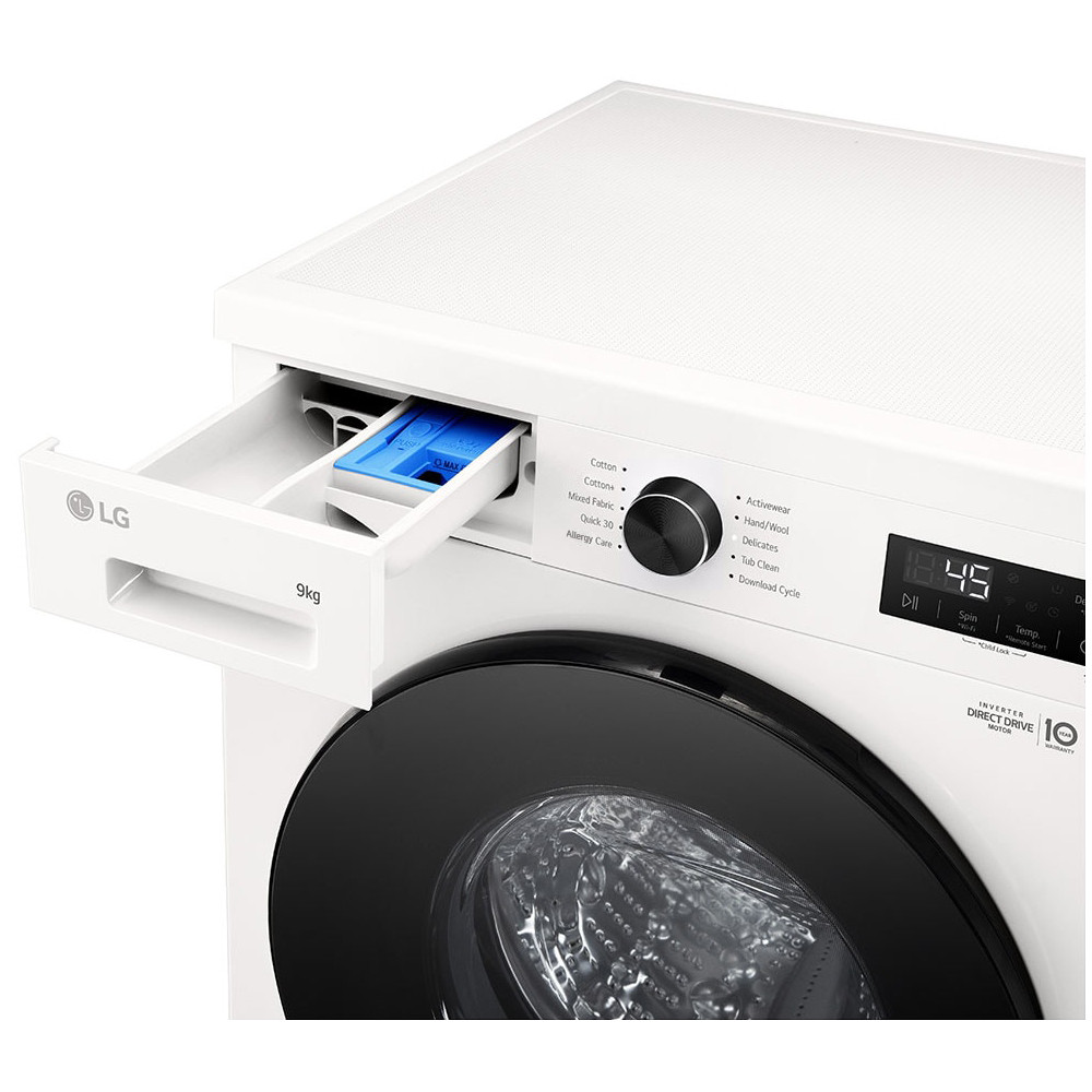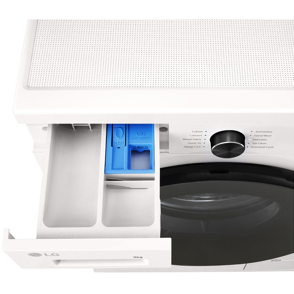 خبر خوب اینکه این ماشین لباسشویی قابلیت دانلود برنامه شستوشوی جدید دارد و دارای برنامه Download Cycle میباشد و شما میتوانید با نصب برنامه LG ThinQ روی گوشی هوشمند Android یا iOS خود برنامه شستوشوی جدید دانلود کنید. متاسفانه این محصول فاقد تکنولوژی بخارشوی یا Steam است. شما میتوانید برای شستوشوی بهداشتی لباسها از برنامه Allergy Care استفاده نمایید تا لباسها ضدعفونی شده و تا 99.9% ذرات آلرژیزا و باکتریها از الیاف پارچه حذف شوند. از دیگر برنامههای کاربردی این محصول میتوان به برنامه Hand/Wool که به برنامه شستوشوی دستی نیز معروف است اشاره کرد که لباسها را با فشاری در حد فشار دست شستوشو میدهد. اگر عجله دارید و میخواهید که شستوشوی لباسهای شما در سریعترین زمان ممکن انجام شود، بهتر است برنامه Quick 30 را اجرا کنید تا در بازه زمانی 30 دقیقه شستوشوی لباسهای شما انجام شود. ماشین لباسشویی مذکور مجهز به برنامه مخصوص تمیز کردن دیگ نیز میباشد که بنا بر گفته ال جی بهتر است آن را ماهی یکبار اجرا کنید تا جرمهای باقیمانده در روزنههای دیگ شستوشو از بین بروند. اگر بوی ناخوشایندی از دیگ شستوشو به مشام رسید بهتر است به مدت 3 هفته، هفتهای یکبار برنامه Tub Clean را اجرا کنید تا بوی نامطبوع داخل دیگ رفع شود. درصورتیکه برای مدتی فراموش کردید برنامه تمیز کردن دیگ را اجرا کنید، خود ماشین لباسشویی اخطاری را روی پنل نمایش میدهد تا شما را از فرارسیدن زمان تمیز کردن دیگ آگاه کند.