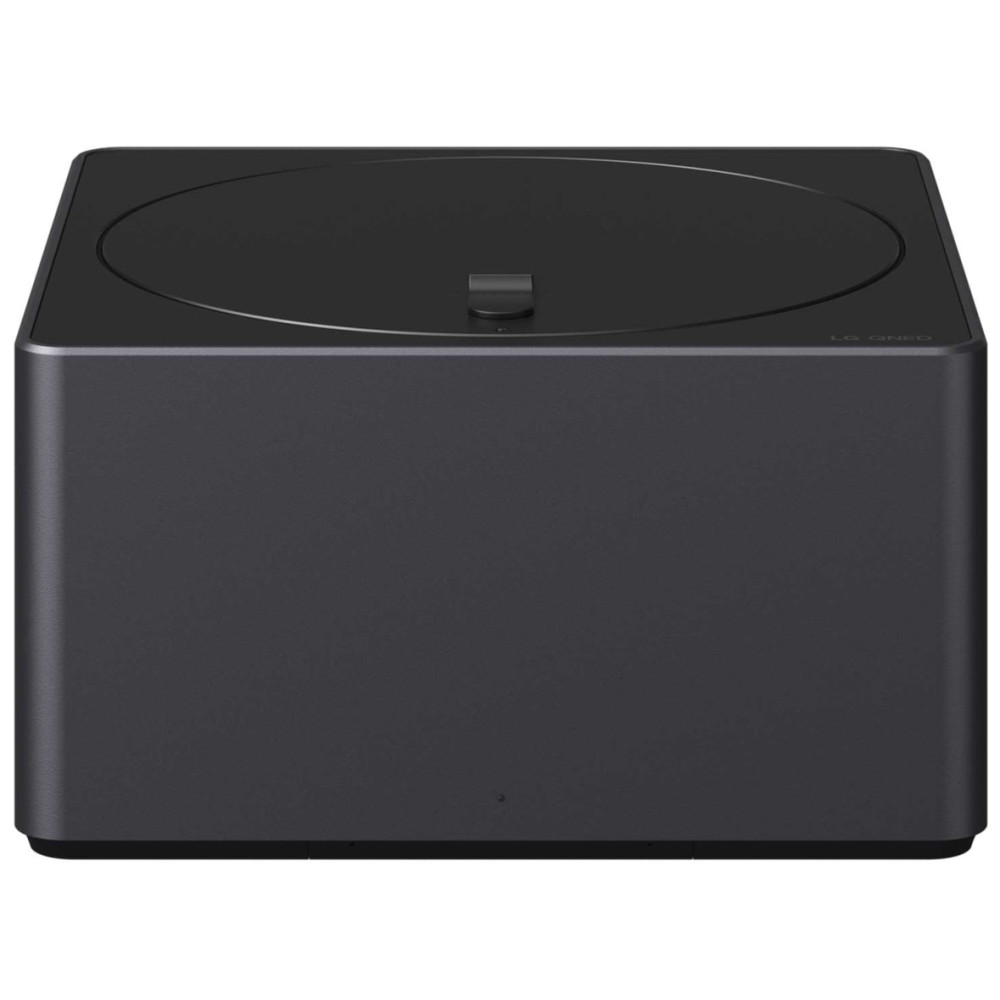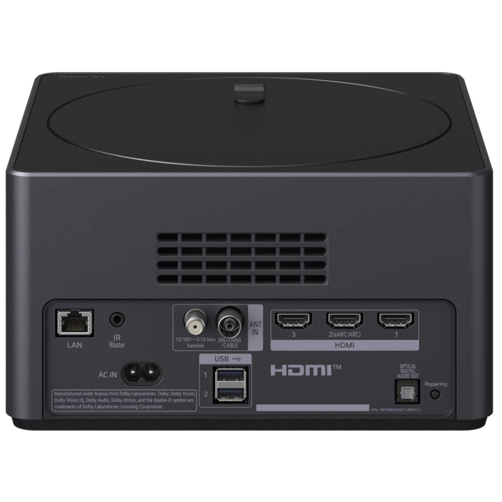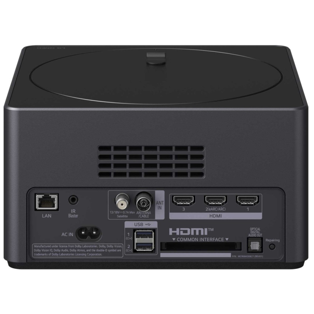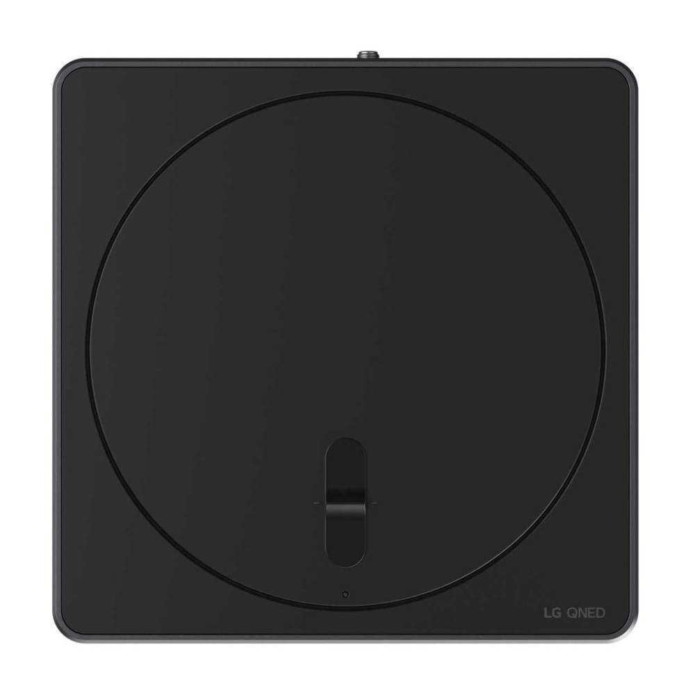 در داخل جعبه این تلویزیون یک بست کمربندی قرار دارد که برای مدیریت کابلهای متصل به Zero Connect Box کاربردی است و شما میتوانید کابلهای متصل به آن را مرتب و منظم کنید. پورتهای ورودی و خروجی این محصول روی دستگاهی به نام زیرو کانکت باکس (Zero Connect Box) قرار گرفتهاند. در حقیقت چیزی که این تلویزیون را از بیشتر تلویزیونهای ال جی متمایز میکند، Zero Connect Box مدل WM25GB همراه آن است. این دستگاه مشابه دستگاه One Connect Box سامسونگ است و همانطور که پیشتر نیز اشاره کردیم، تمام پورتهای ورودی و خروجی تلویزیون (به جز کابل برق) روی آن تعبیه شده است. البته نکته جالب توجه در مورد Zero Connect Box این است که این دستگاه بهصورت بیسیم (Wi-Fi) به تلویزیون متصل میشود و میتواند تمامی دادهها و سیگنال های صوتی و تصویری را از طریق باند بیسیم 60 گیگاهرتز با بالاترین کیفیت ممکن به تلویزیون منتقل نماید؛ بنابراین شما باید تمام دستگاههای مورد نظر خود را به Zero Connect Box متصل کنید چون هیچ پورت ورودی و خروجی روی تلویزیون وجود ندارد. این موضوع باعث میشود تا هیچ کابل اضافهای در اطراف تلویزیون وجود نداشته باشد و حتی احتیاجی به مرتب کردن کابلها در پشت تلویزیون نداشته باشید. دستگاه Zero Connect Box که در جعبه این تلویزیون و به همراه آن عرضه میشود، دارای ابعاد 230x230x121.7 میلیمتر و وزن 2.4 کیلوگرم است. این دستگاه به شکل یک مکعب مستطیل مشکی رنگ میباشد که طراحی مینیمال و زیبایی دارد. در قسمت بالای زیرو کانکت باکس یک صفحه گردان دایرهای شکل وجود دارد که به کمک آن میتوانید زاویه سیگنال ارسالی به تلویزیون (به سمت چپ و راست) را تنظیم کنید و آن را بهصورت ساعتگرد و پادساعتگرد بچرخانید. بعلاوه یک کلید نیز در این قسمت تعبیه شده است که با جلو و عقب بردن آن میتوانید زاویه سیگنال ارسالی به تلویزیون را به سمت بالا و پایین تنظیم نمایید. در این قسمت یک نشانگر LED نیز تعبیه شده است که قدرت و دقت سیگنال ارسالی به تلویزیون را نشان میدهد تا با توجه به آن دستگاه یاد شده را در جای مناسبی قرار دهید. اگر این نشانگر LED به رنگ آبی باشد، یعنی سیگنال قوی و عالی است؛ رنگ سبز به معنای سیگنال خوب، زرد نشاندهنده سیگنال ضعیف و رنگ قرمز به معنای قطع شده سیگنال میباشد. همچنین نشانگر LED دیگری نیز در جلوی زیرو کانکت باکس قرار دارد که خاموش و روشن بودن دستگاه را نشان میدهد. همانطور که پیشتر نیز اشاره کردیم، Zero Connect Box این تلویزیون از میکروفون داخلی برخوردار است اما ال جی دکمهای برای خاموش و روشن کردن این میکروفون داخلی روی این دستگاه تعبیه نکرده است.