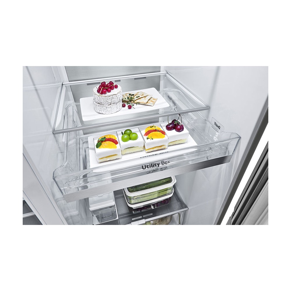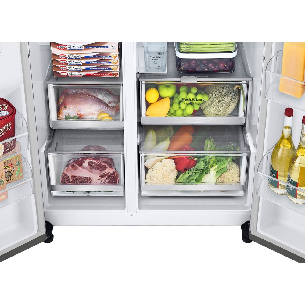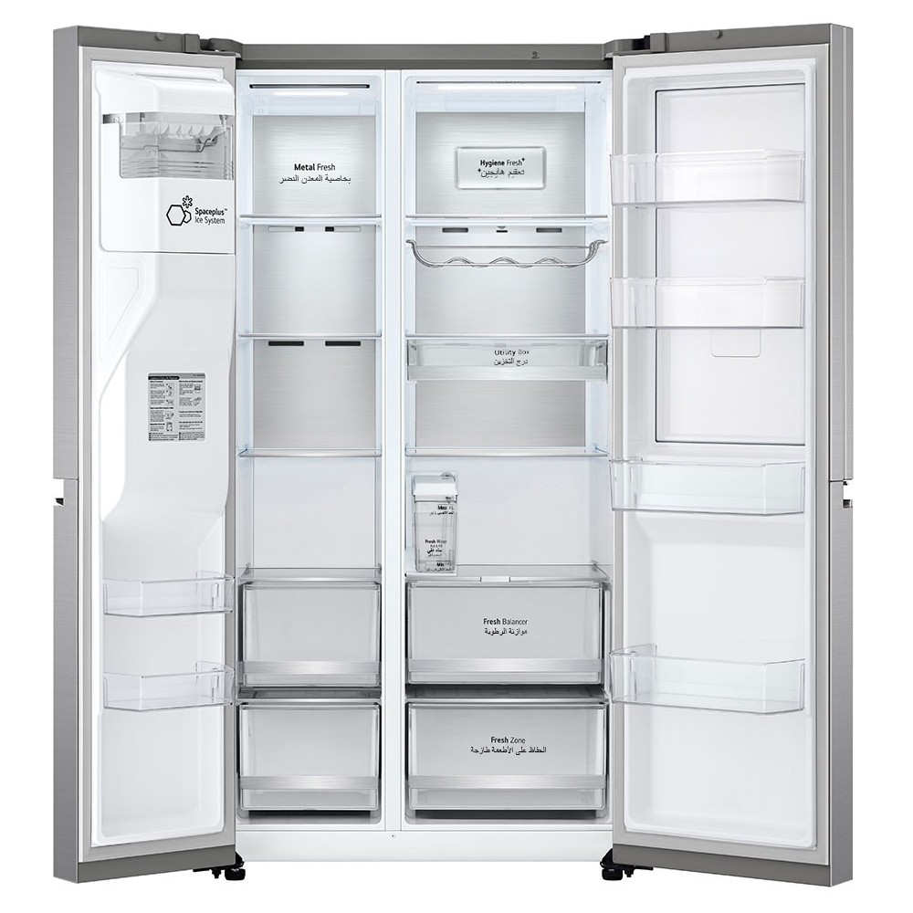 همانطور که پیشتر نیز خدمت شما عرض کردیم، لبه جلویی طبقات و کشوهای یخچال فریزر ساید بای ساید ال جی GCJ-287TVL از جنس فلز میباشد؛ این موضوع موجب زیبایی بیشتر فضای داخل یخچال فریزر شده است و علاوهبر آن، در حفظ زیبایی آن نیز تاثیرگذار است و از هدررفت سرما نیز جلوگیری میکند. ال جی این نوع از طراحیها در یخچال فریزرهای خود را Metallic Decoration نامیده است. همچنین دیواره داخلی انتهای قسمت یخچال و همچنین فریزر این محصول از یک صفحه فلزی به نام Metal Fresh ساخته شده است. وجود این صفحه باعث میشود تا سرمای تولید شده در داخل یخچال فریزر هنگام برخورد با این سطح فلزی جذب شود تا دمای داخلی یخچال فریزر پایدار بماند. علاوهبر آن، وجود این صفحه فلزی باعث میشود تا هنگام قطعی برق یا باز ماندن درب یخچال فریزر برای مدت طولانی، سرمای آن تا حد زیادی حفظ شود.