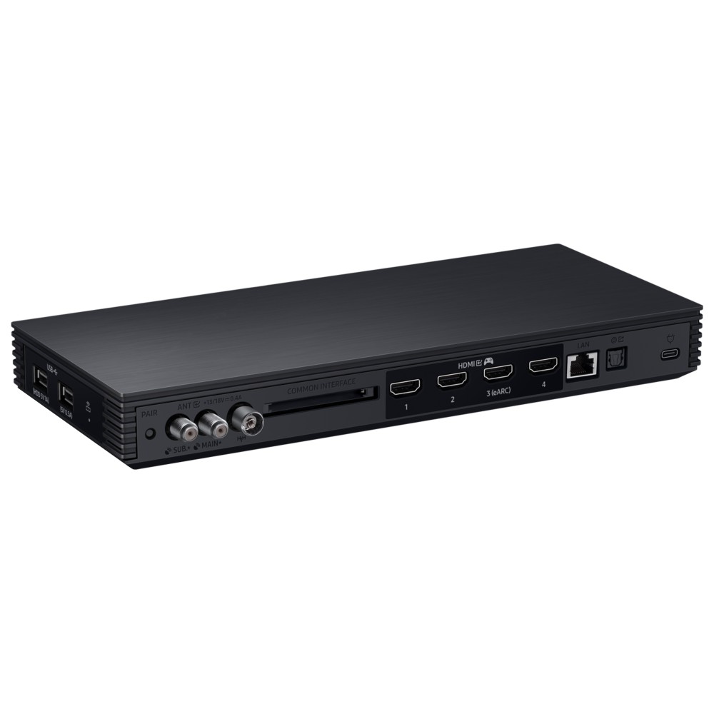 همانطور که پیشتر نیز خدمت شما عرض کردیم، تقریبا تمامی پورتهای تلویزیون فوق روی دستگاهی به نام Wireless One Connect Box قرار گرفتهاند و روی بدنه تلویزیون تنها 3 پورت وجود دارد؛ پورتهای روی بدنه تلویزیون شامل 1 پورت USB-C، یک پورت Micro HDMI 2.1 و همچنین 1 پورت ورودی دستگاه Power Box (One Connect Power Box) میباشد که در ادامه بیشتر در مورد آن توضیح خواهیم داد. پورت USB-C مذکور یک پورت 5 ولت 1 آمپر میباشد که طبق گفته سامسونگ برای اتصال دوربین سامسونگ مدل Slim Fit Cam (SlimFit Cam) و همچنین اتصال حافظه جانبی یا فلش USB Type-C به تلویزیون مورد استفاده قرار میگیرد اما ما هنوز این موضوع را تست نکرده و از آن مطمئن نیستیم. بنابراین در آینده در صورت تست و بررسی و اطمینان از این موضوع اطلاعات دقیقتری را با شما به اشتراک میگذاریم.