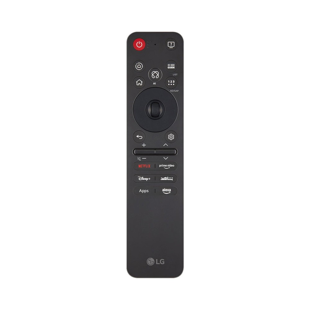 از جمله مهمترین تغییرات مهمی که در تلویزیونهای 2025 ال جی به چشم میخورد، میتوان به ریموت کنترل آنها اشاره کرد. اگر از جمله کاربران تلویزیونهای ال جی باشید، احتمالا میدانید که ال جی چند سال بود که تغییری در ریموت کنترلهای خود ایجاد نکرده بود و هر سال تنها مدل آنها را تغییر میداد؛ اما امسال این شرکت کرهای با طراحی جدید و مدرن ریموت کنترل خود وارد عرصه رقابت شد و قواعد بازی را تغییر داد. ال جی امسال یعنی در سال 2025، ریموت کنترل جادویی، هوشمند و بلوتوثی خود را با نام AI Magic Remote و با مدل MR25GA عرضه کرده است و از آن در این تلویزیون و اکثر تلویزیونهای 2025 خود استفاده نموده است. همانطور که احتمالا متوجه شدهاید، عبارت AI بهکاررفته در نام این ریموت کنترل، اشاره به هوش مصنوعی و دکمه AI جدید این ریموت کنترل دارد که در ادامه به کاربرد آن خواهیم پرداخت. ریموت کنترل جدید ال جی هم از نظر امکانات و هم از نظر ظاهر، تفاوتهای زیادی با ریموت کنترلهای سالهای گذشته ال جی دارد. همانطور که از مدل این ریموت کنترل مشخص است، فاقد NFC میباشد و در نتیجه از قابلیت Magic Tap نیز در آن خبری نیست. امسال ظاهر ریموت کنترل جدید ال جی شبیه به ریموت کنترلهای سامسونگ و سونی شده است اما همچنان اصالت و قابلیتهای کلیدی خود را حفظ کرده است. ریموت کنترل مذکور ابعاد جمعوجورتر و گوشههای تیزتری دارد و در قسمت پشت آن برجستگیهای ریزی تعبیه شده تا از دست شما سر نخورد. جنس بدنه این ریموت کنترل نیز بهتر شده و برخلاف مدل قبلی آن مات است؛ همچنین رد چربی و اثر انگشت کمتری را به خود جذب میکند و از آن مهمتر در مقابل خطوخش نیز مقاومت بیشتری دارد که واقعا عالی است. این ریموت کنترل با دو عدد باتری نیمقلمی کار میکند و ال جی یک جفت از آنها را در جعبه محصول قرار داده است. کوچکتر شدن باتری و سبک شدن ریموت کنترل در کنار طراحی جدید آن باعث شده تا وزن کمتری داشته باشد و نسبت به مدلهای قدیمی سبکتر و خوشدستتر باشد. ال جی تغییرات اساسی و زیادی در این ریموت کنترل اعمال نموده است و حالا این ریموت کنترل جدید ظاهری سادهتر و مینیمالتر دارد. از جمله این تغییرات میتوان به حذف دکمههای عددی (0 تا 9) اشاره کرد! در واقع به جای دکمههای مذکور یک دکمه روی این ریموت کنترل قرار داده شده است و هنگامی که آن را بفشارید، کیبورد مجازی روی صفحه نمایان میشود و از این طریق به اعداد دسترسی خواهید داشت. همچنین همانطور که عرض کردیم ما شاهد یک دکمه AI جدید در این ریموت کنترل هستیم که البته این دکمه جایگزین دکمه میکروفون شده است اما عملکرد آن کمی متفاوت است. طبق تستهای ما، زمانی که این دکمه را یکبار بفشارید، قابلیت AI Chatbot تلویزیون اجرا میشود؛ شما میتوانید از این قابلیت برای حل برخی مشکلات احتمالی خود هنگام کار با تلویزیون و همچنین برای پیشنهاد محتوای مورد علاقه خود کمک بگیرید. البته در مدل مشابه سال گذشته این تلویزیون قابلیت مشابهی با نام Chatbot وجود داشت اما ال جی امسال آن را به قابلیت AI Chatbot ارتقاء داده است و این یعنی این قابلیت حالا هوشمندتر شده و دقیقتر عمل میکند. درصورتیکه دکمه AI مذکور را فشرده و برای چند لحظه نگه دارید، میتوانید به کمک میکروفون داخلی آن، از قابلیت AI Search برای جستوجوی صوتی محتوا و اجرای دستورات صوتی استفاده نمایید. ال جی امسال برای نخستین بار در تلویزیونهای جدید خود از جمله این تلویزیون از هوش مصنوعی مایکروسافت یعنی Microsoft Copilot استفاده نموده است و شما میتوانید در برخی جستوجوهای صوتی خود از آن استفاده نمایید. همچنین برنامه Microsoft Copilot نیز در فروشگاه برنامه ال جی قرار گرفته است که میتوانید با نصب آن روی تلویزیون نیز از این هوش مصنوعی استفاده کنید. طبق تستهای ما در کمال تعجب قابلیت AI Search در اکثر موارد جملات و کلماتی که به عنوان دستورات صوتی یا جستجوی صوتی به آن دادیم را بهدرستی متوجه نمیشد و این موضوع کمی عجیب است چراکه در تلویزیونهای قبلی ال جی چنین مشکلی وجود نداشت؛ ما احتمال میدهیم که این مو